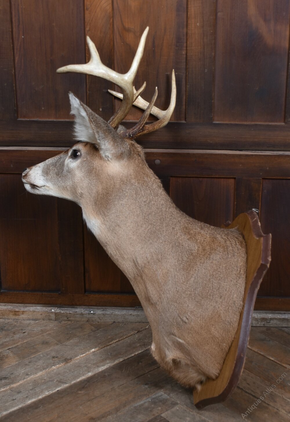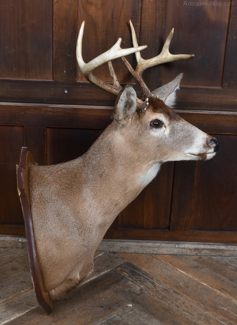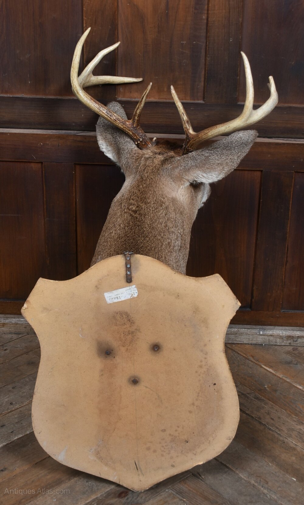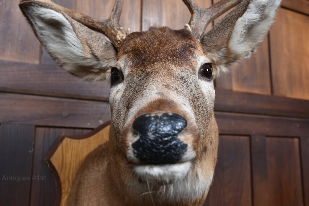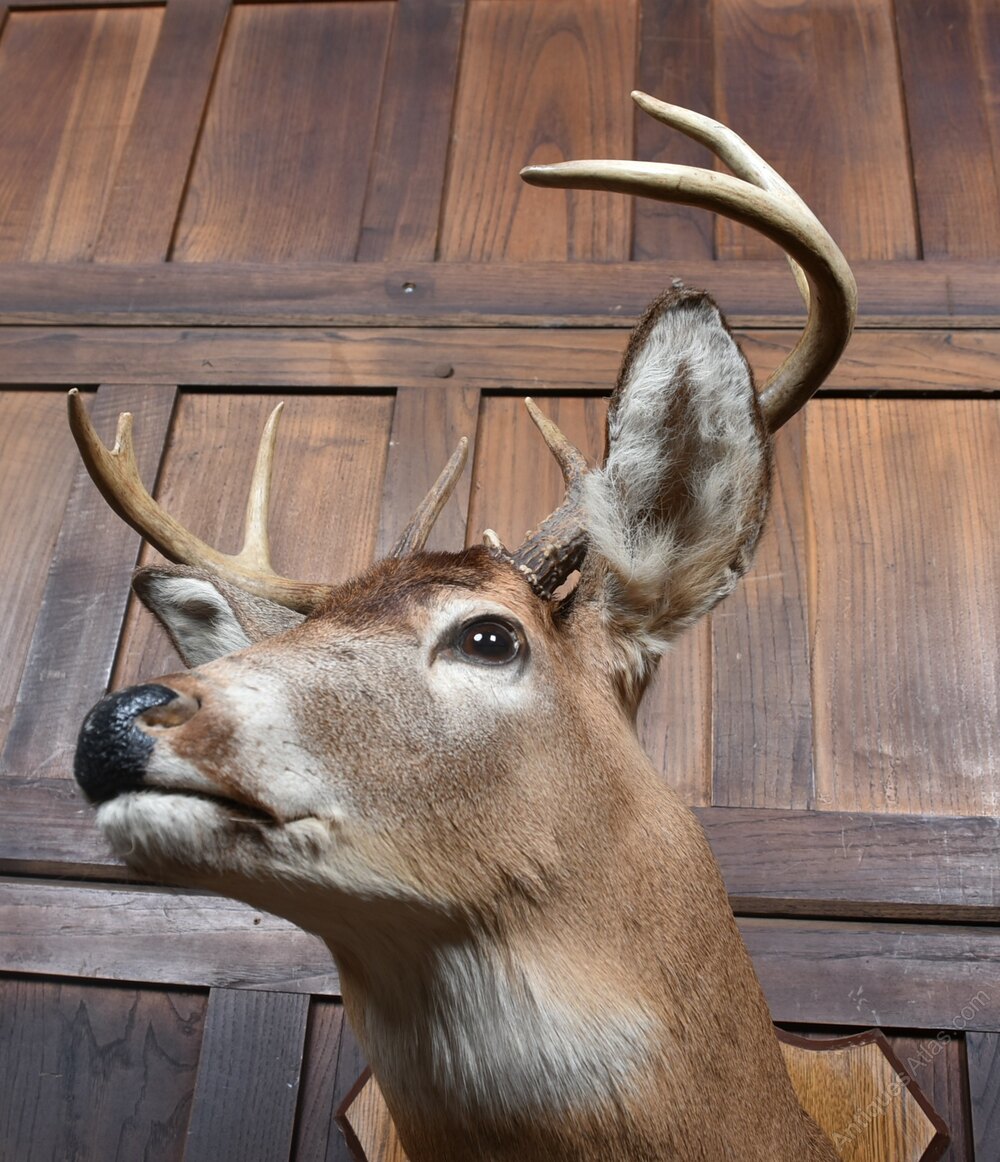 A striking taxidermy whitetail deer shoulder mount, beautifully presented on a shield shaped wooden backboard. The mount displays a fine mature buck with well‑formed antlers, natural colouring, and lifelike detailing to the face, ears, and coat. The craftsmanship is confident and sympathetic, giving the piece strong presence without feeling overly dramatic. The wooden shield‑shaped plaque complements the warm tones of the fur and makes the mount easy to hang and display. The reverse retains its original fixing plate and label. A classic decorative piece for a lodge‑style interior, country house, bar, study, or eclectic wall display — full of character and traditional charm.Internal Reference: SAI4147