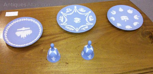 Five pieces of Wedgwood, three plates all in perfect condition and a pair of bells, again perfect. The plates are impressed on the rear.