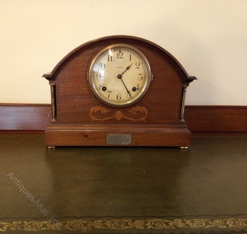 This inlaid dome top clock is a rather pleasing example. It has a plaque from the 1920s on the front as it was presented as a retirement momento to an S Ryan. This has not been restored so has a little light fade but the inlays are clean and all in place. It has a pair of brass pillars on each side of the case and still retains its original disk shaped feet. The movement is in working order and there is a key. Keenly priced at only £135.Description35cms wide