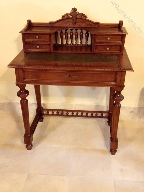 A very pretty little French Desk, 'bonne heure du jour'. this has lots of interesting detail. The writing area, ie the leathered part slides forward to give a better space to write on but then slides back for neatness when not in use. The are four useful little drawers on the top and a further one underneath. The centre of the gallery has turned spindles and a little carved decoration above them. The legs are supported by a double rail with turned spindles. There is light relief carving in the walnut on the drawer fronts and other places. Lovely little item in very clean condition with new/ replacememt leather, ready for a new home.Description83cms wide