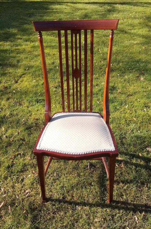 This is a pretty occasional or bedroom chair in great condtion having been cleaned in our workshops. It has been freshly reupholstered in a neutral fabric that should conflict with nothing in most homes. As can be seen in the pictures the top rail on the back is string inlaid in the Mahogany and it has stretchers in the base to give extra support to the legs. could suit a pretty dressing table perhaps. All in all a good looking pretty chair in mahogany and beech that is in great condition. It will not break the bank at only £185 either. Give us a call if you would like to discuss 01565 874075Descriptionback height 96cms. Seat depth 40cms width 44 and seat height is 45 cmsDimensionsearly 1900sDateas017a2313Code01565 874075Contact£185 Price€212.75 $252.21 Euro & Dollar conversion rates as of 16/FEB/2026 Always confirm final price with dealer