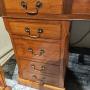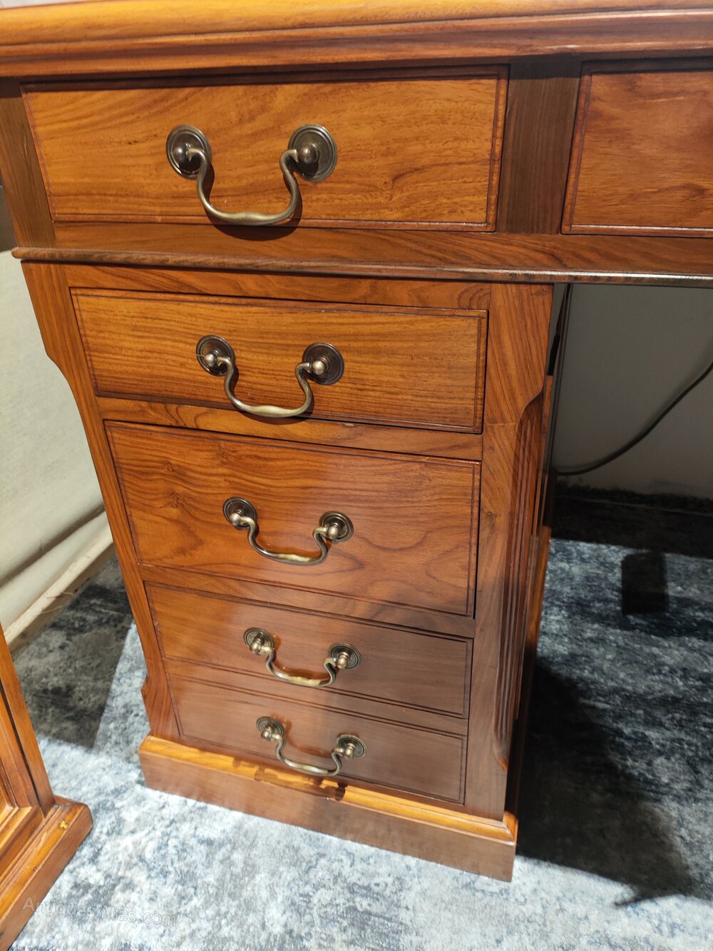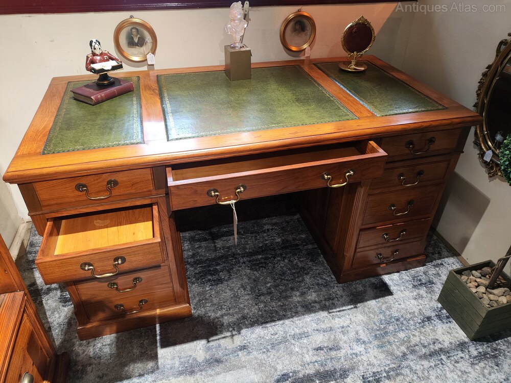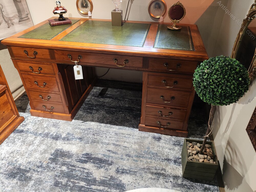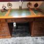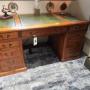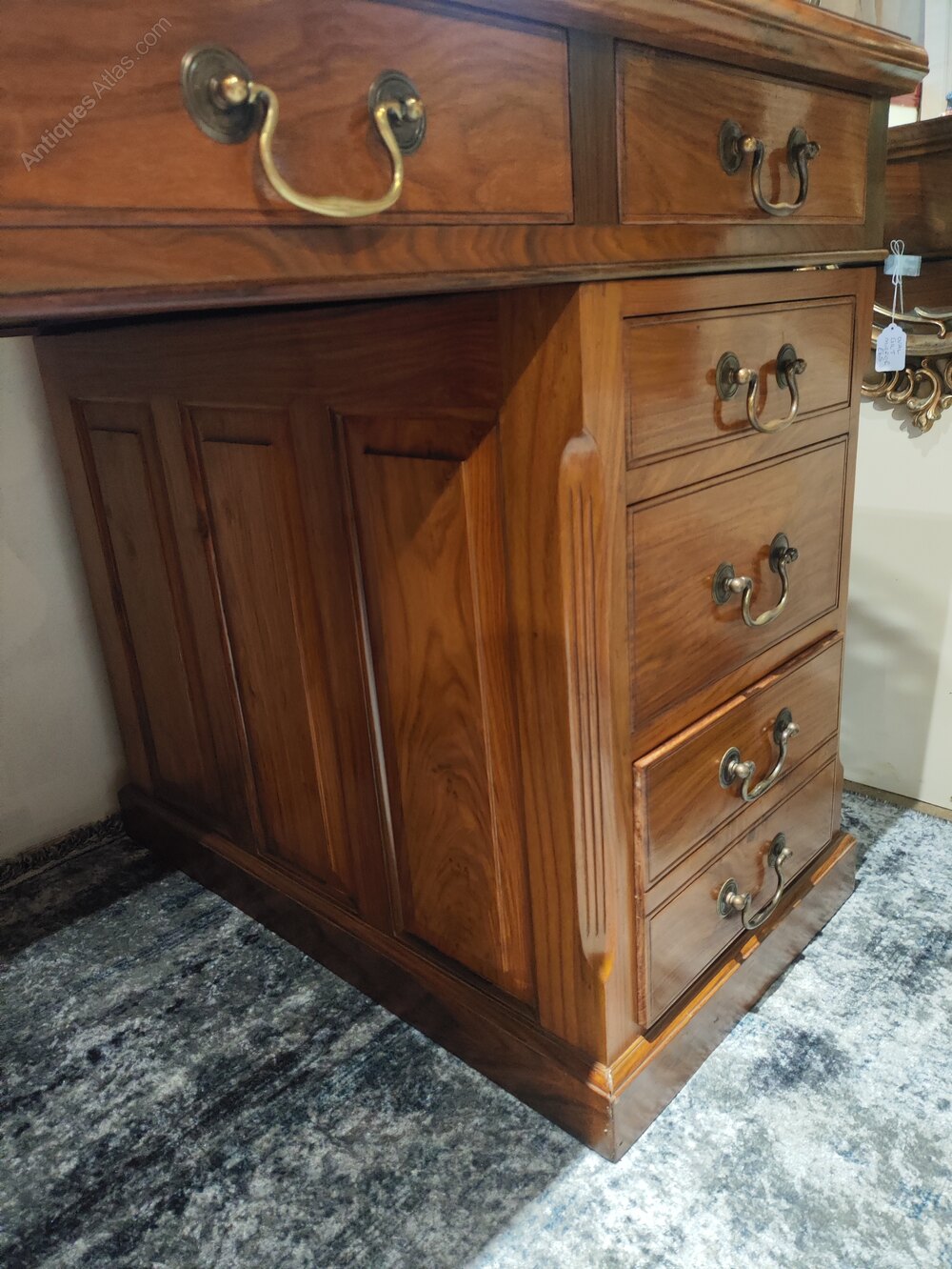 Quality French Walnut twin pedestal Desk.Six drawers in total with swan neck brass handles. Green leather top.