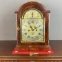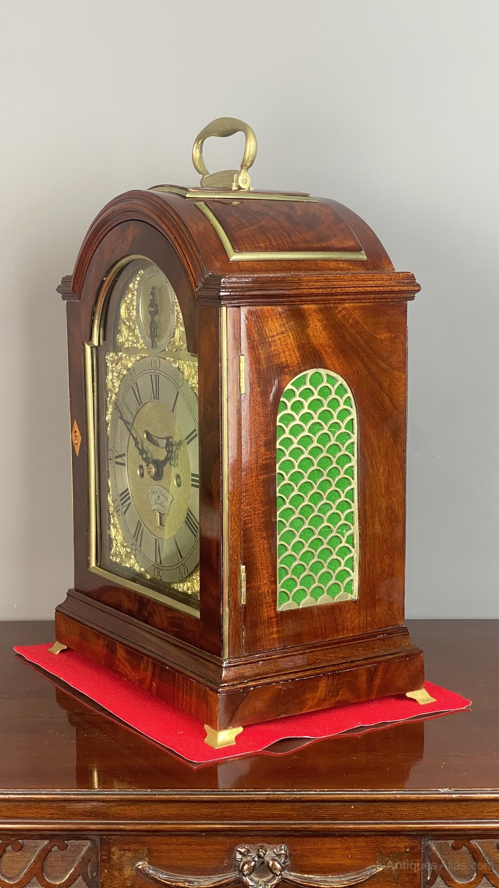The mahogany case is a stunning example. The case have been refinishing by our master craftsman french polisher/case restorer. The break arch door and pads to the top of the case are surrounded with brass banding giving the clock that extra elegance (please note the feet are not original)