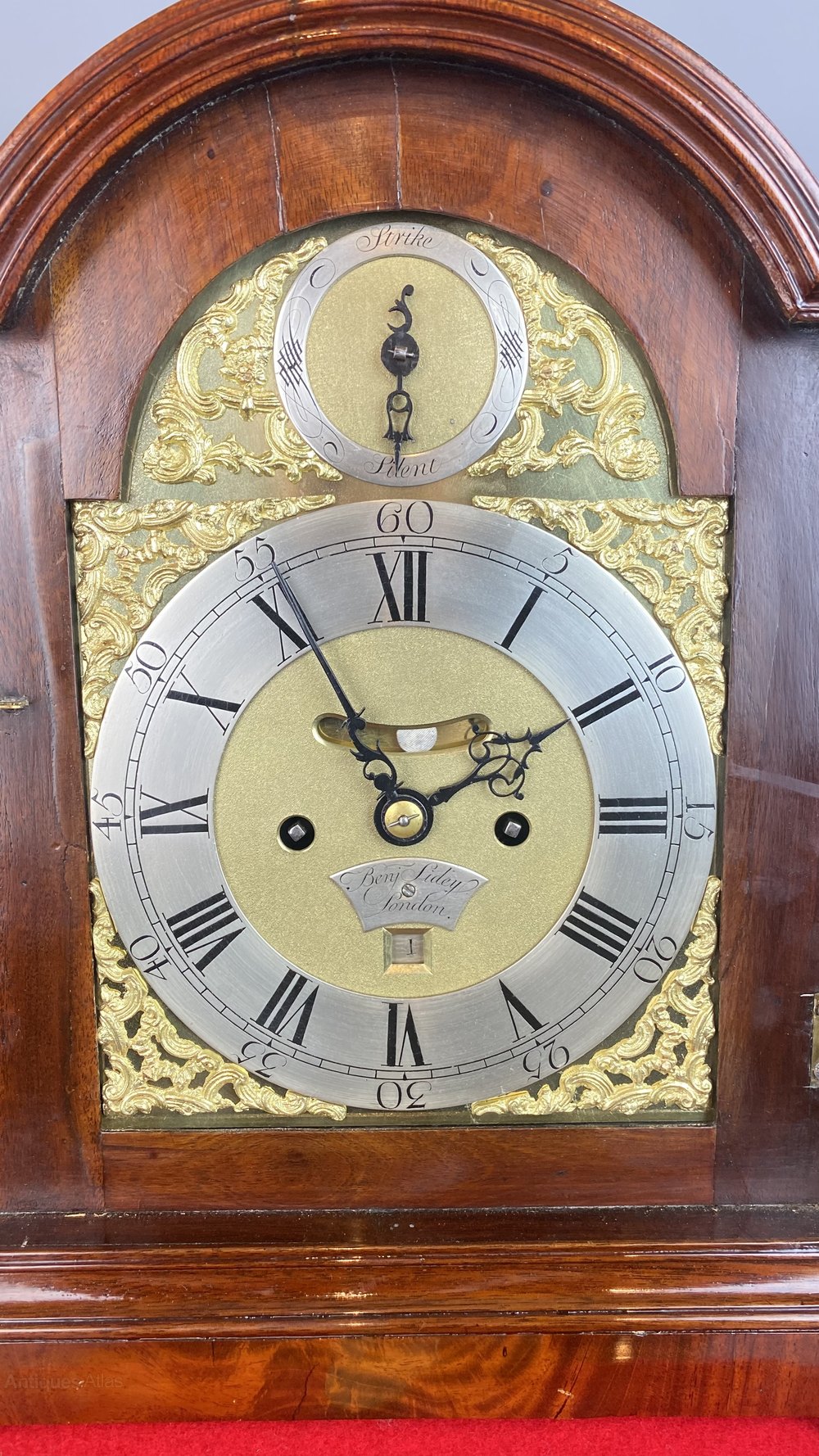 The 7 inch brass break-arch dial with calendar and false bob apertures and silvered nameplate signed Benj Sidey, London has also been fully restored to give the the dial a fresh lease of life for many years to come. The pierced steel hands and rococo scroll cast spandrels are a fantastic compliment to the dial and subsidiary strike / silent dial.