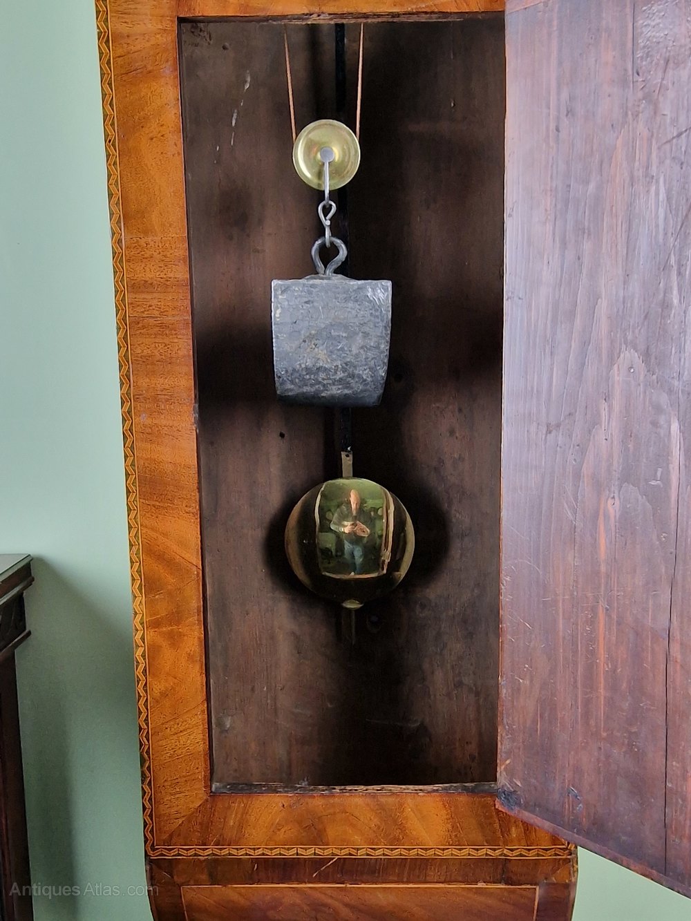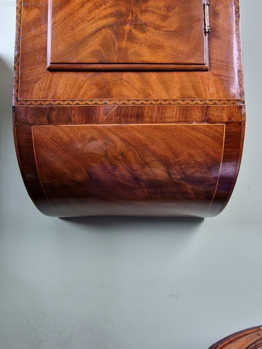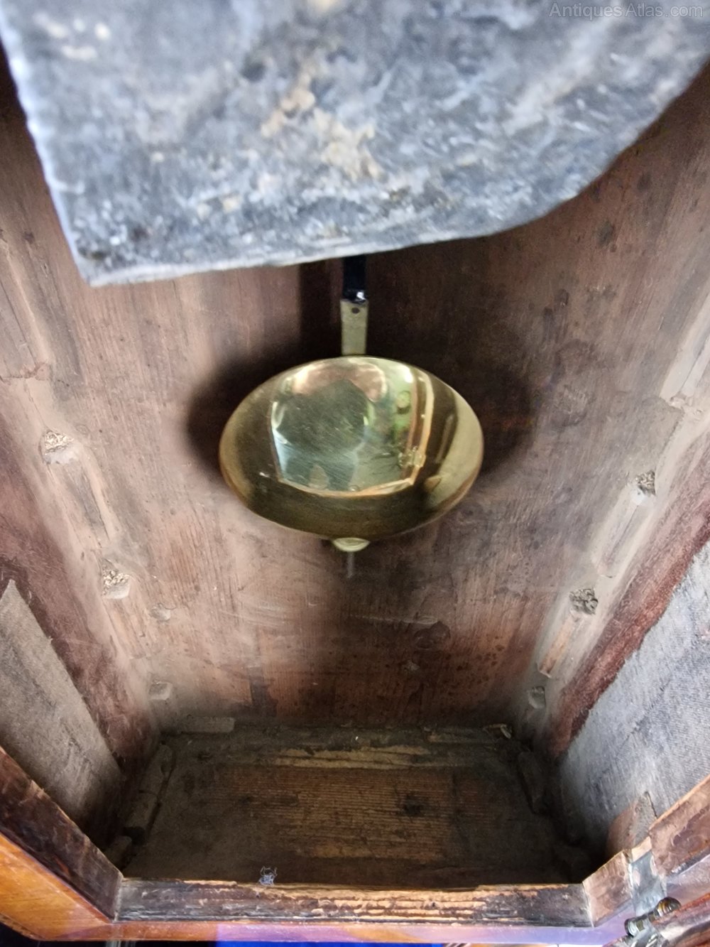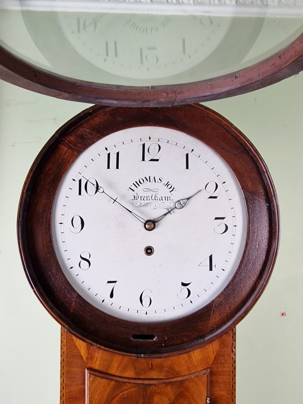 Here is a stunning quality mahogany tavern clock circa 1850. The case is in fantastic untouched condition retaining its original finish with intricate inlay to the edges of the trunk. This clock is 1 of 2 that I obtained from a private collector known for collecting some fine examples. The 14inch dial made by William Finnemore is signed Thomas Joy of Brentham. After much research I've come to the conclusion that this is the retailers name. The longer duration movement is of fantastic quality having been regularly cleaned and serviced by the previous owner. This clock must be seen to be appreciated for its originality and condition. The dimensions are 120cm (47.inches) long 46cm(18 inches) wide at the hood. 18cm(7inches) deep at the trunk which in my opinion make it a wonderful size.