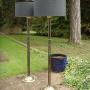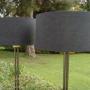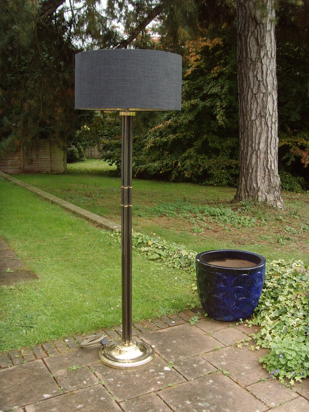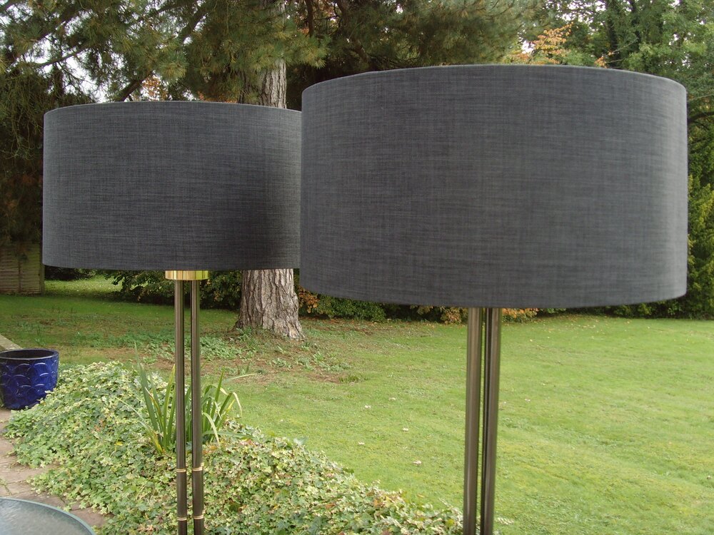 The bespoke shades are 24 inch diameter cylinders in a dark grey hopsack material, lined with gold, as shown in the photographs.
