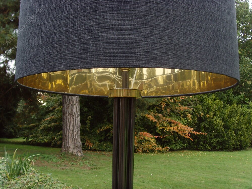 We are offering for sale this elegant and stylish pair of Brass Standard Lamps and new Shades.The Lamps have circular brass bases, with a quadruple cluster column stand in gunmetal coloured patinated brass, with a double brass ringed section in the centre. The columns terminate in a circular brass section.