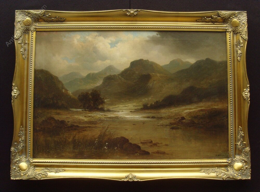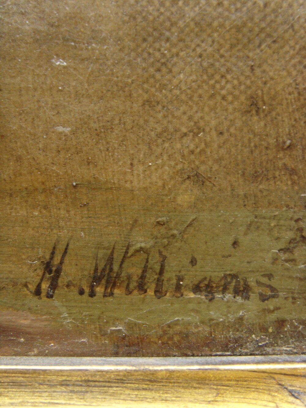We are offering for sale this large oil on canvas by the artist H. WILLIAMS, who has signed the painting in the lower right hand corner and inscribed it verso 'On the Conway'. The painting depicts a view of a the River Conway or Afon Conwy, with a mountainous backdrop. The river is meandering its way through grassy and wooded slopes. It is a blustery day, with a storm cloud looming from the right and a small patch of blue sky, through which the sun is shinging and being reflected on the waters below.We have consulted our reference books and, although we always try to give biographical information on the artists that we show, sometimes this is impossible, and that is the case here. Either the artist did not exhibit, in which case he would not appear in our books, or, he is one of the eight artists listed with the initial H and the surname Williams. We have also looked on the internet auction sites and they seem similarly confused, as, although there are some paintings shown by this artist, works that are obviously not by him are listed with his. Findartinfo.com lists 20 paintings by this artist under the name H. Williams, although there is one painting which is obviously by another H. Williams, an Australian artist. Artnet.com lists 7 paintings by this artist and shows examples of three, although the middle one is obviously a watercolour by an earlier artist. Therefore, the painting must stand on its merits and the buyer must do their own research.