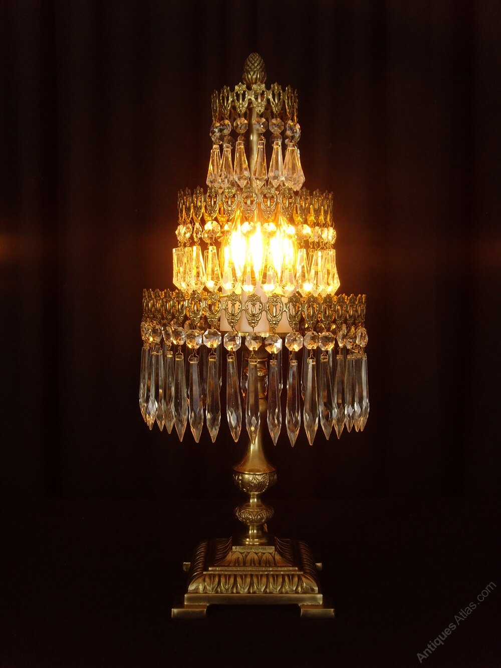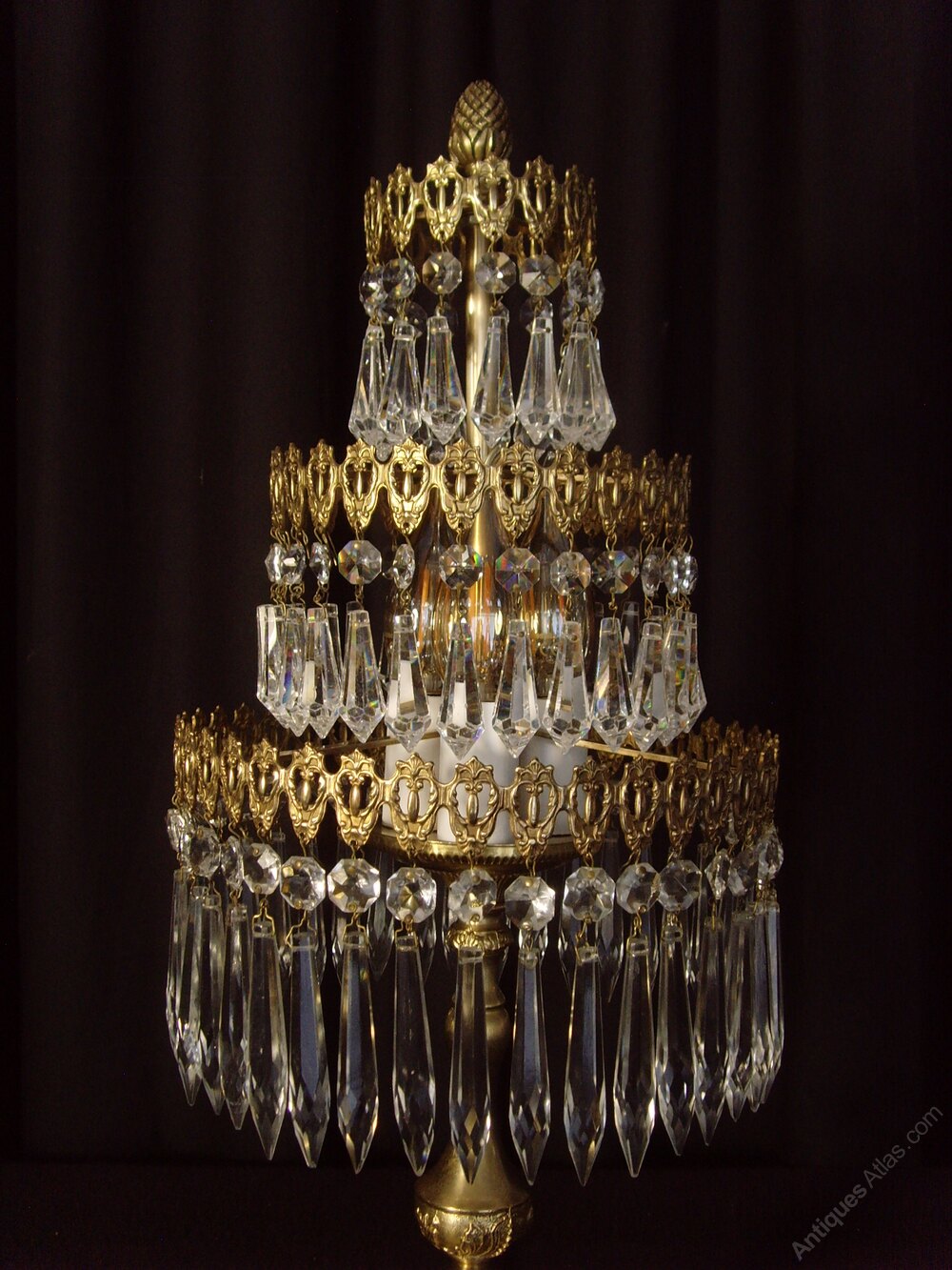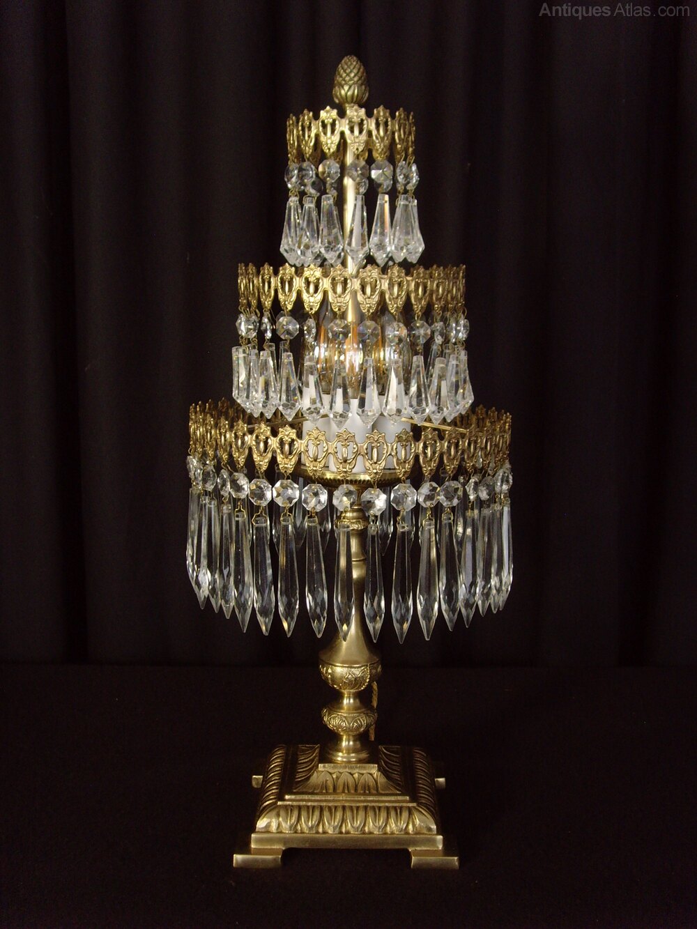 We are pleased to offer this superb three tier Waterfall Chandelier Table Lamp in brass. This beautiful lamp would add a sparkle to any Christmas event or other celebratory gathering.The top two tiers of the lamp have button and short drops, while the bottom tier has button and icicle drops.