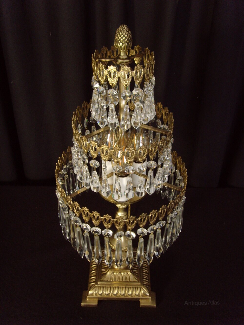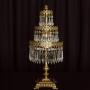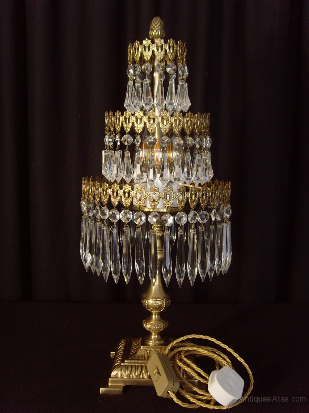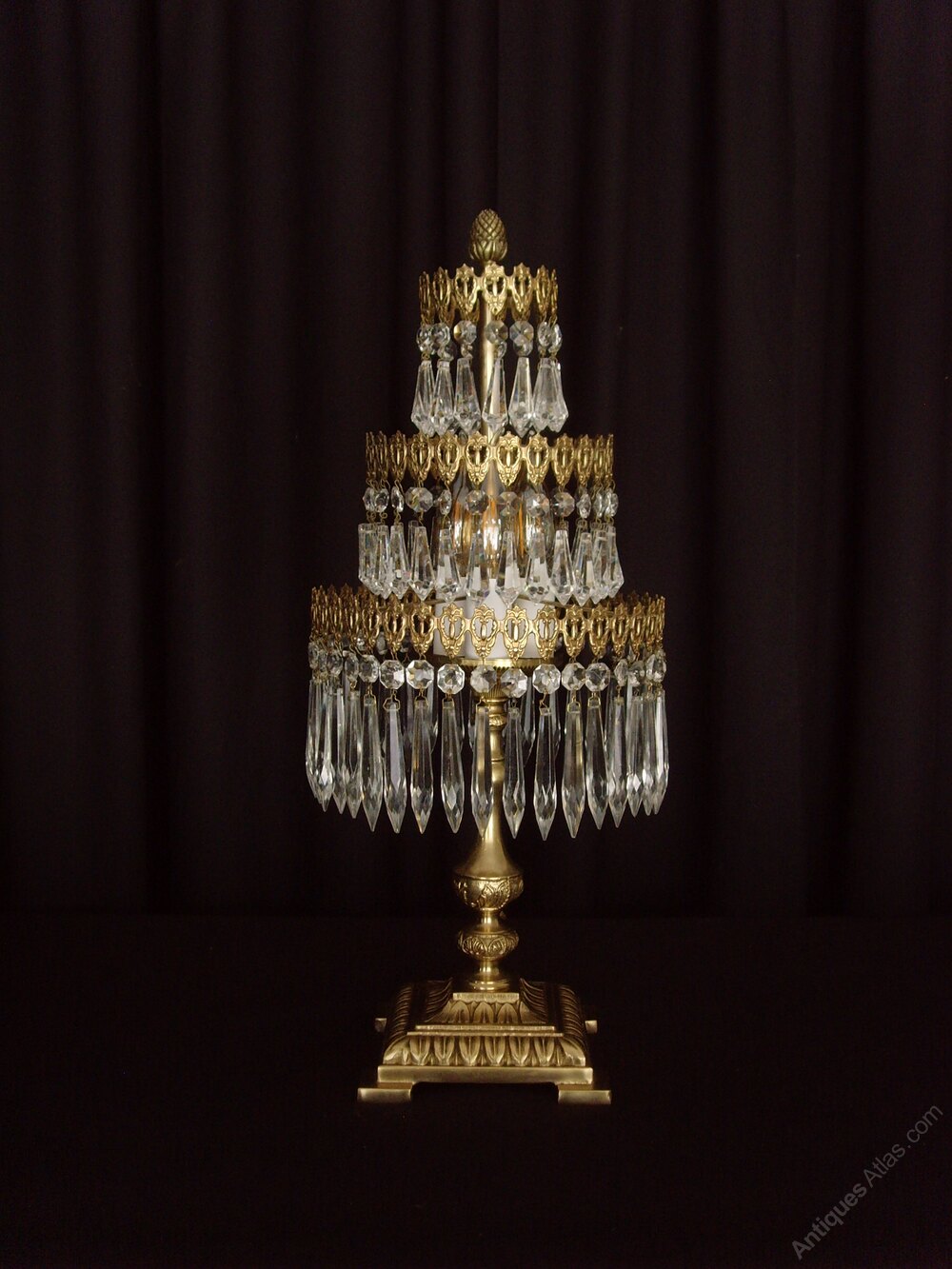 We are pleased to offer this superb three tier Waterfall Chandelier Table Lamp in brass. This beautiful lamp would add a sparkle to any Christmas event or other celebratory gathering.The top two tiers of the lamp have button and short drops, while the bottom tier has button and icicle drops.