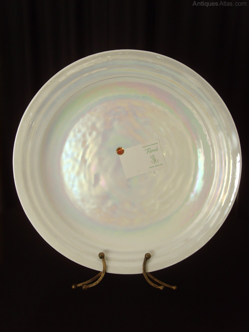 This is a large, beautiful 'Mother of Pearl' Glass Platter by Fornace Ferro Murano in the Venetian Lagoon which bears their card of authentication. Their glassworks is at Fondamenta S. Giovanni dei Battuti 4, Murano, Venezia. They produce some beautiful bowls, dishes and platters in a variety of designs, patterns, colours and shapes. This platter dates to the 2000s.The Platter has a flat centre with a raised, stepped rim and has been made in pearlised glass, that has the look of Mother of Pearl or Nacre. The name Yalos Casa Murano is acid etched on the base, which has an orange peel surface and is not highly glazed like the surface. Unfortunately, it has proved impossible to photograph this mark on this colourway, but it is present towards the centre of the platter. The Yalos Casa or House of Yalos collection comes under the umbrella of the Ferro Family.