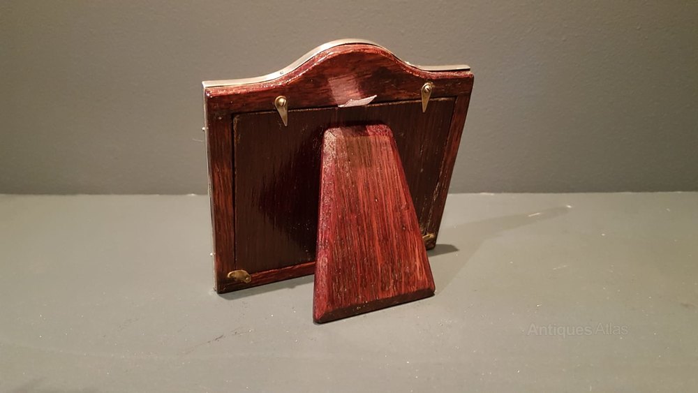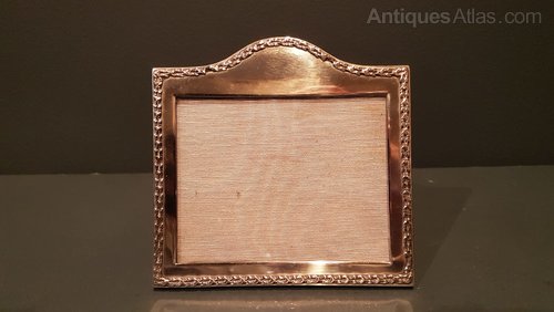 An Edwardian period solid silver photo frame with embossed decorative boarder and arched top, hallmarked London 1908. The polished silver face with arched top and embossed laurel wreath design boarder, the silver returning around the sides to meet the polished oak back with sturdy easel stand. Presented in immaculate condition with a deep shine. Takes photo 4" x 3". Measures 5" wide x 4.75" high x 0.5" deep. Stock number 36084.Tracked and insured postage for this item is £8.00 for mainland UK. Please contact us for delivery abroad.
