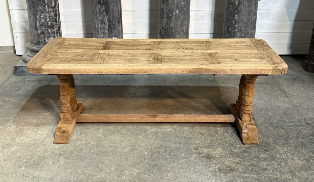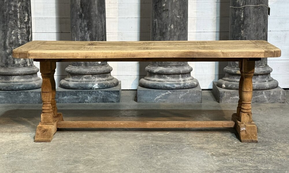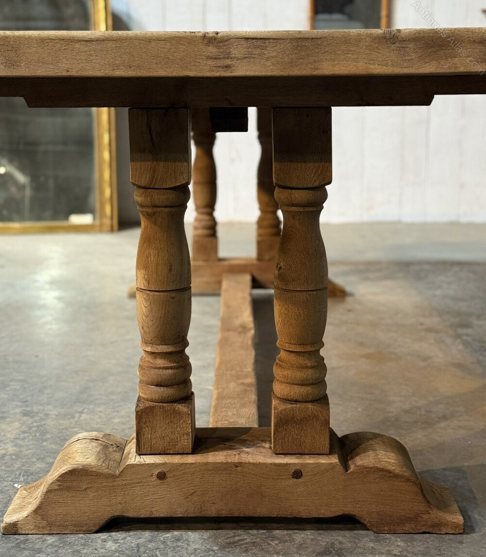 A lovely Farmhouse Table having the rare advantage of being deep at 89cm. Great looking top with just the right amount of character. French in origin and dating to the early 1900s, of good quality construction and completely comes apart for easy access into the home. We have bleached it for a lighter look and in excellent condition.Length 219 cm