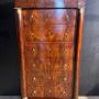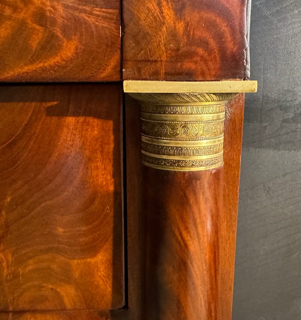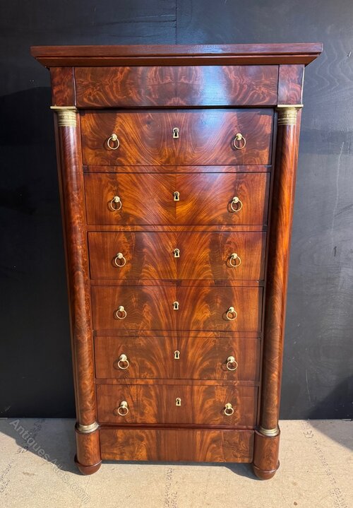 A stunning French Empire Tall Chest of Drawers. I have never seen one of these dimensions being narrow. Made of Flame Mahogany with Brass Empire caps to the side column tops and bottoms. Having 8 smoothly running drawers. Very good quality construction with original panelled back.We have re French polished it so in excellent overall condition for the home.
