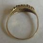 An opal and ruby navette gold ring - Size L.Three good white opals - largest 4mm - spaced by 2 rubies to each side (ca 1.5mm) claw-set in yellow gold. The style is typical of late Victorian or Edwardian rings, but this is later - hallmarked for 9ct in London 1984.