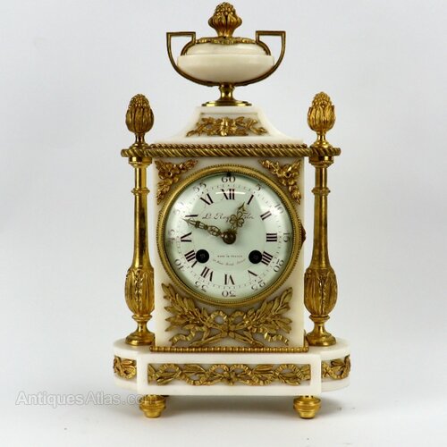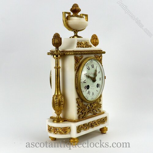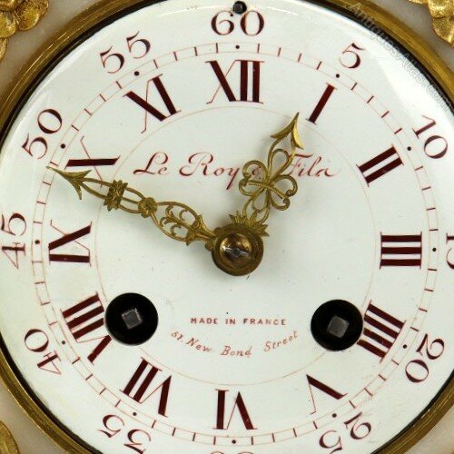 H:31cm W:18cm D:10cmA late 19th century French white marble and ormolu mantel clock by Le Roy & Fils, the elegantly proportioned white marble case enriched with finely modelled gilt bronze mounts, the circular white enamel dial with Roman numerals signed “Le Roy & Fils, 51 New Bond Street”, indicating retail by the firm’s prestigious London premises, fitted with an 8-day movement striking the hours and half-hours on a bell, and made in France.