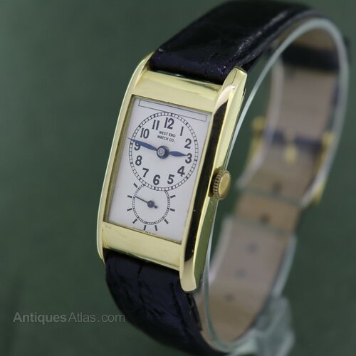 Many manufacturers produced watches of this type during the late 1920s and 1930s, including Rolex, Longines, Gruen, and Vertex. Another maker that produced similar examples was the West End Watch Company, a Swiss brand known for manufacturing durable wristwatches for international markets. The watch described here follows the same medical-watch concept and features a rectangular Art Deco case with an oversized seconds register, together with an 18-carat gold case bearing Swiss hallmarks.