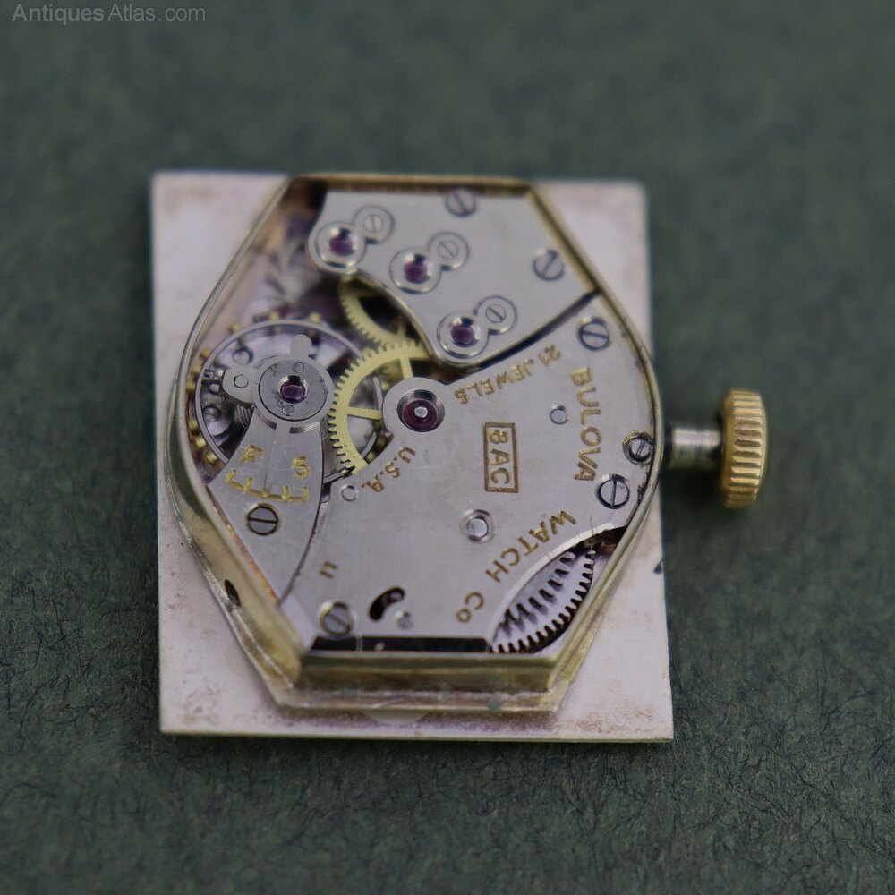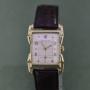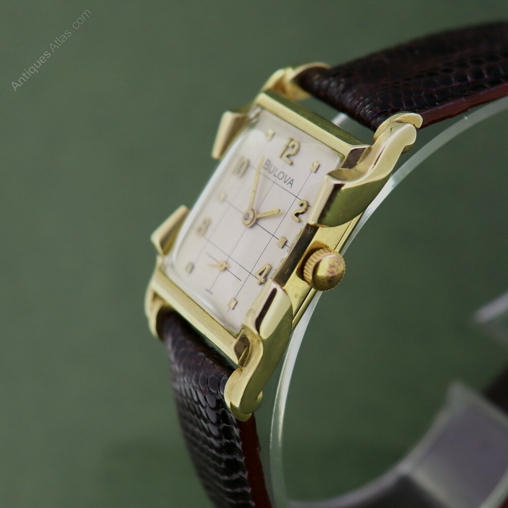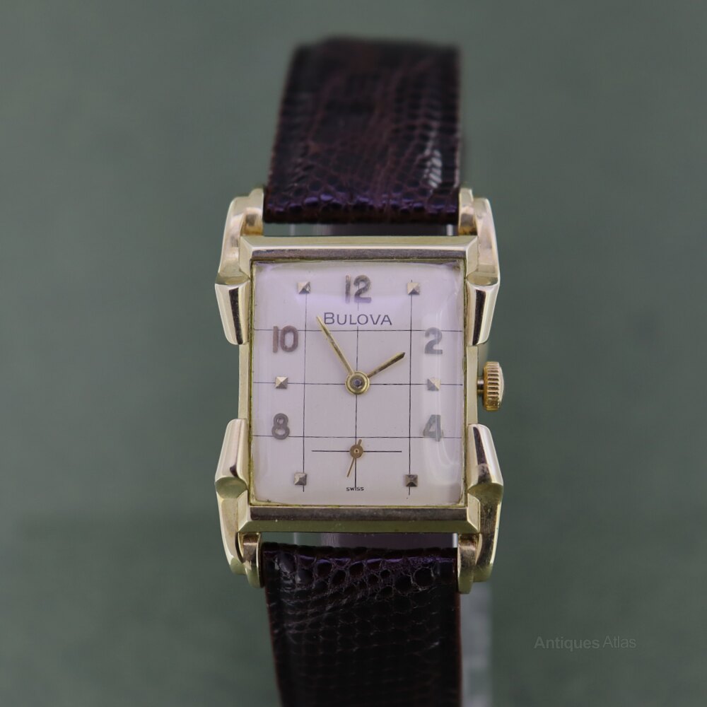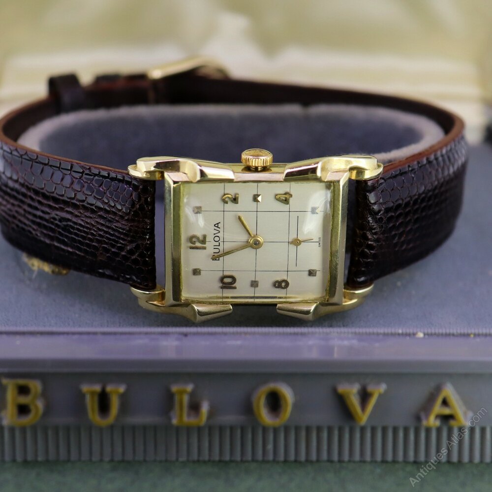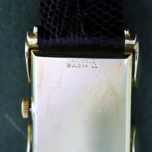 An Art Deco style vintage oblong Bulova wristwatch from 1951. The 21 jewel 8ac movement signed Bulova USA. the white dial with Arabic and square hour markers. The 14ct solid gold case signed Bulova 14k and L1 (1951 code). This watch comes with a vintage Bulova box.