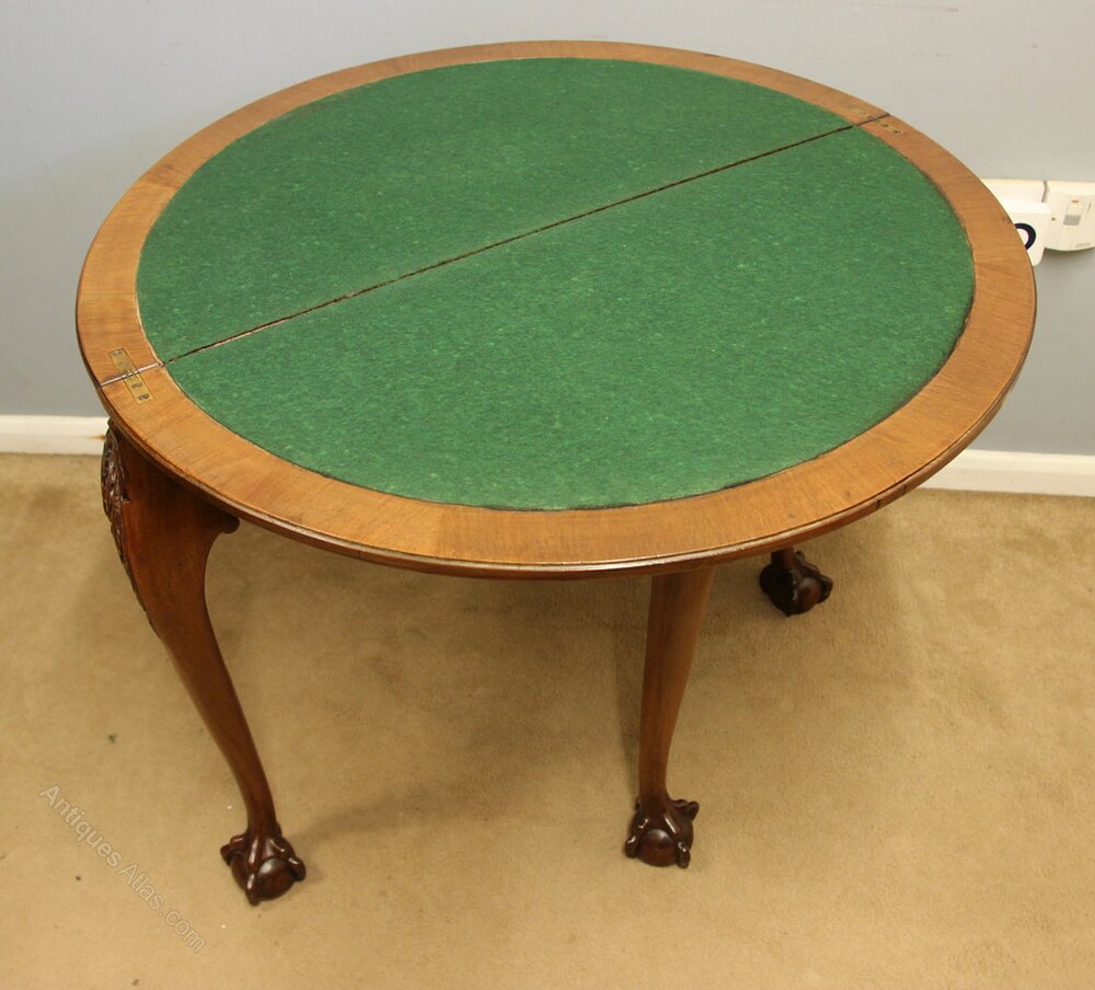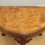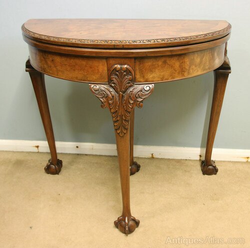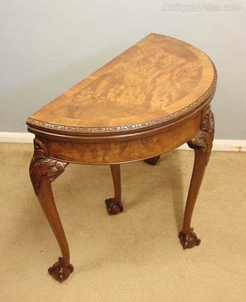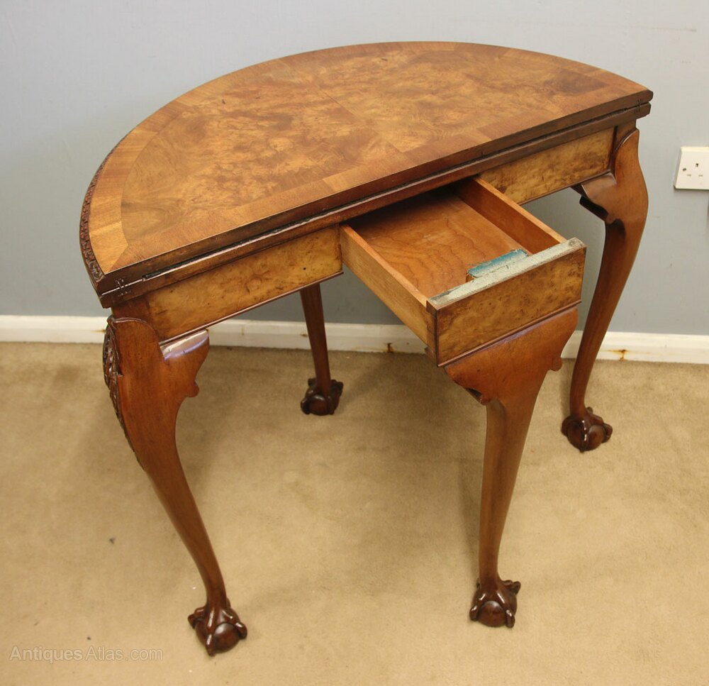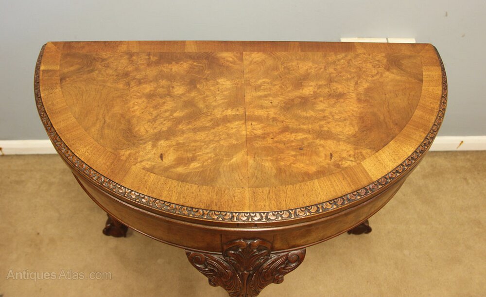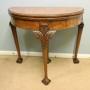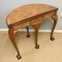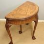 Antique Burr Walnut Console Card Side Table, This wonderful burr walnut demi lune shaped console card / games table has a lovely burr walnut crossbanded top with a carved edge. Having a wonderful burr walnut frieze under and all supported by carved and scroll queen anne style legs with ball and claw feet. The centre rear leg pulls out to reveal a drawer to store cards etc. The top of the table opens to reveal a baize playing surface.-