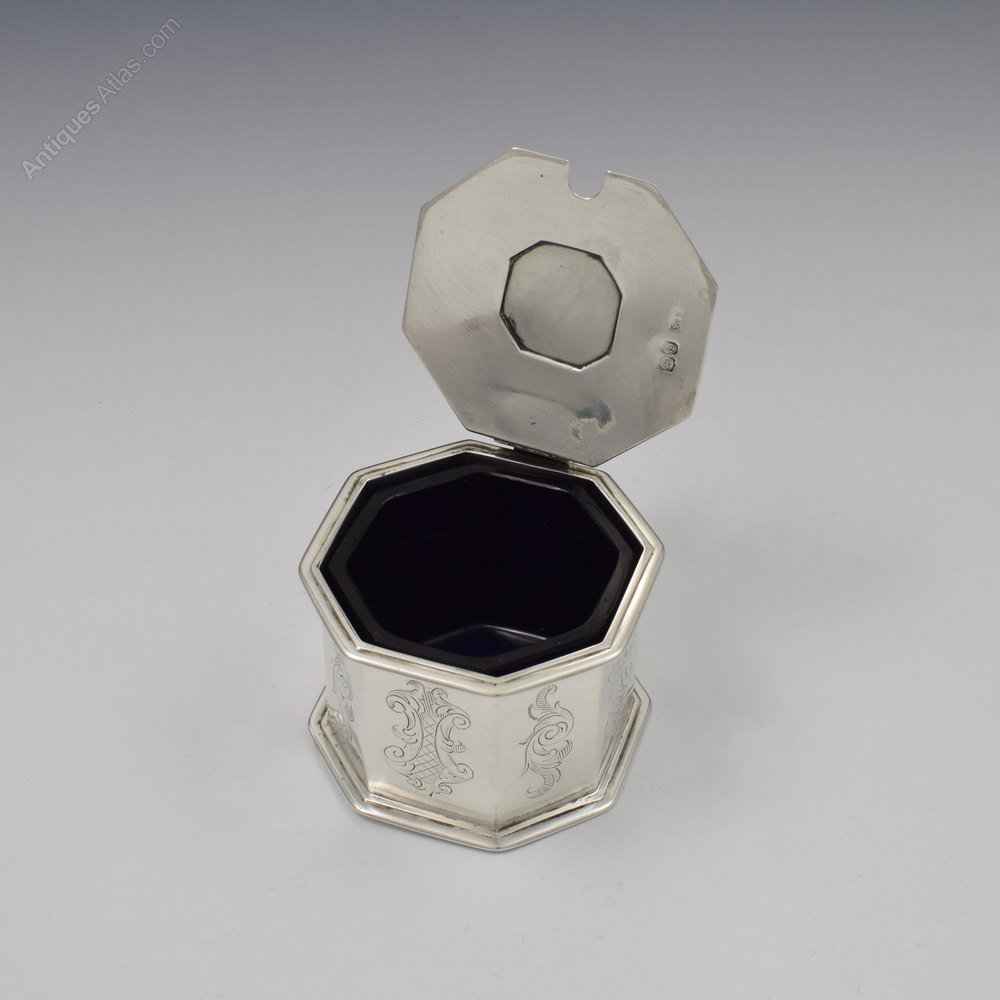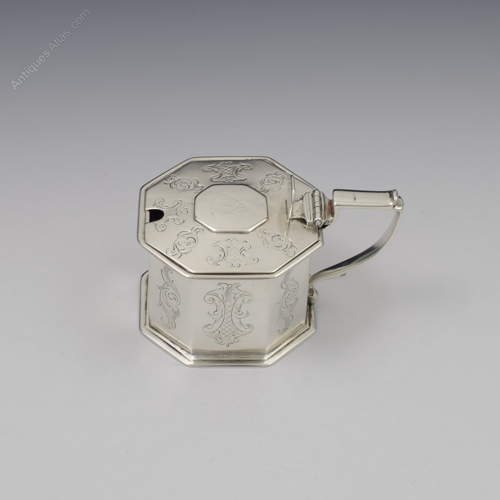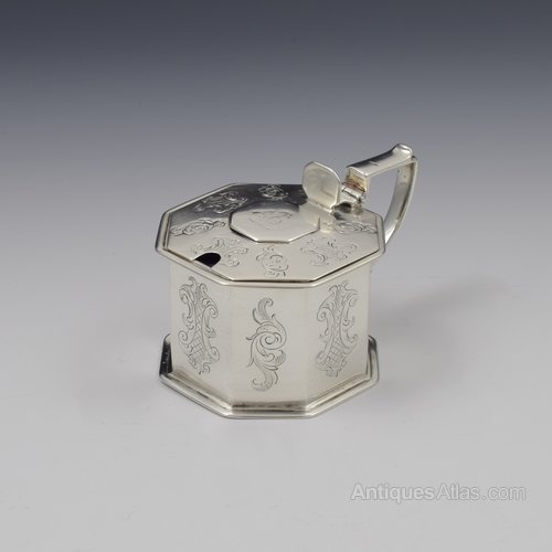 A good early Victorian silver mustard pot of octaginal shape with stepped detail around the base and squared "7" shape handle with scrolled lower terminal, outer spur and upcurved thumb rest. Octagonal opening thumb catch and octagonal cartouche overlaid to the cover. Hand engraved symbolic devices to each panel and around the edge of the cover and the central cartouche engraved with a fletcher holding an arrow. Fitted with the likely original blue glass liner. Hallmarked for London 1839, maker William Forrester, partial marks inside the cover.It measures 6.3cm (2 1/2") high to the thumb catch, 10.2cm (4") rim to handle and 7cm (2 3/4") wide. It weighs 266g in total with the liner, 142g / 4.6ozt silver weight.