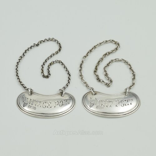 An attractive pair of silver wine labels of kidney shape with double reeded border and each fitted with a silver chain. A perfect gift for port lovers, they are engraved for "Vintage Port" and "Light Port". Hallmarked for Sheffield 1902, maker J & J Maxfield Ltd.They measure 3.8cm (1 1/2") by 2cm (3/4").