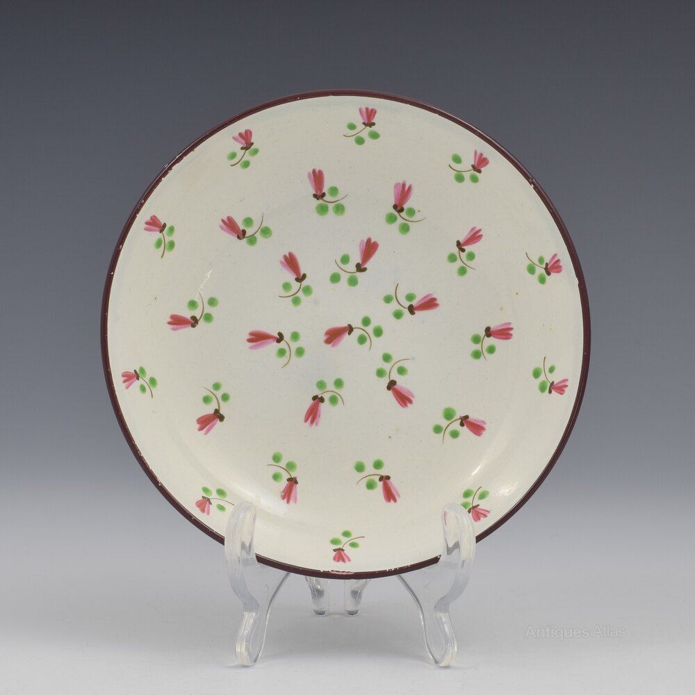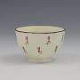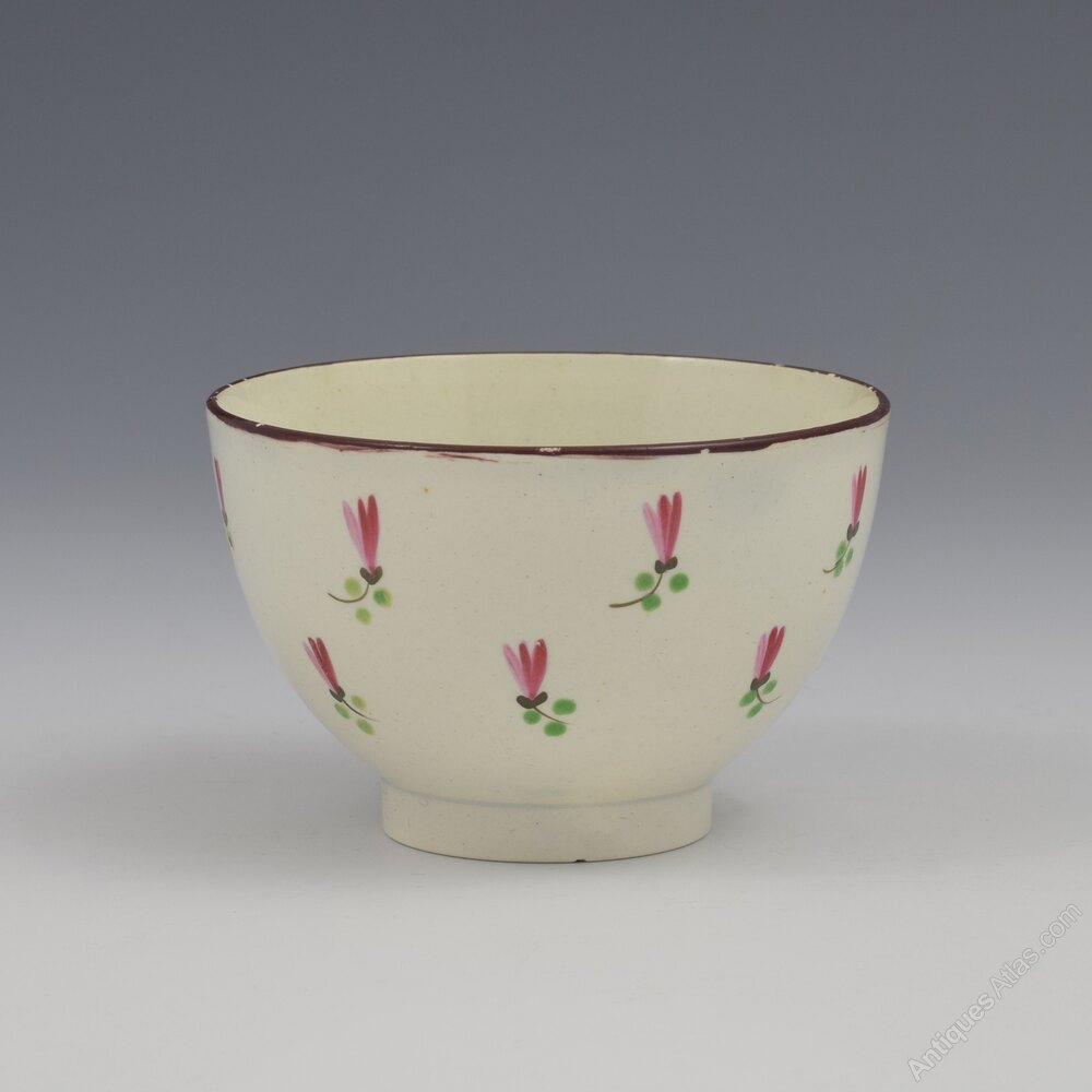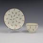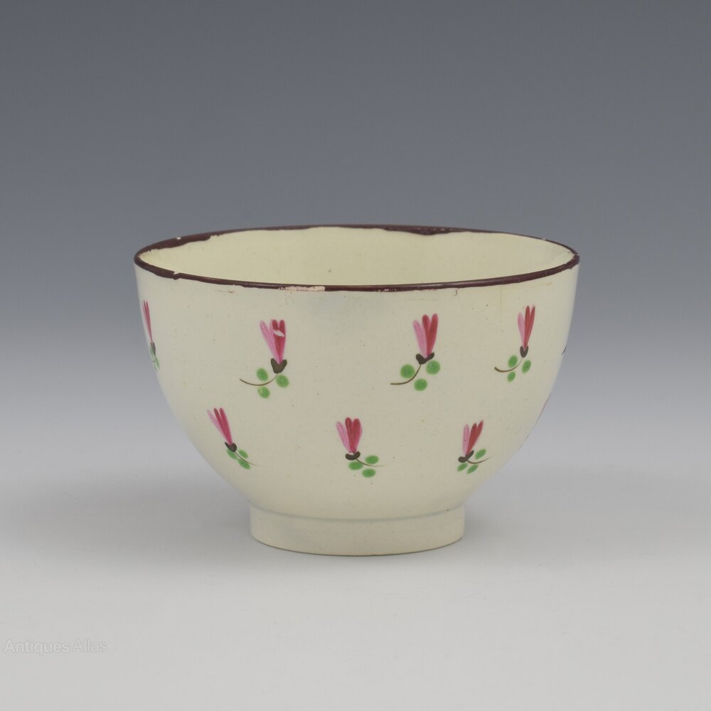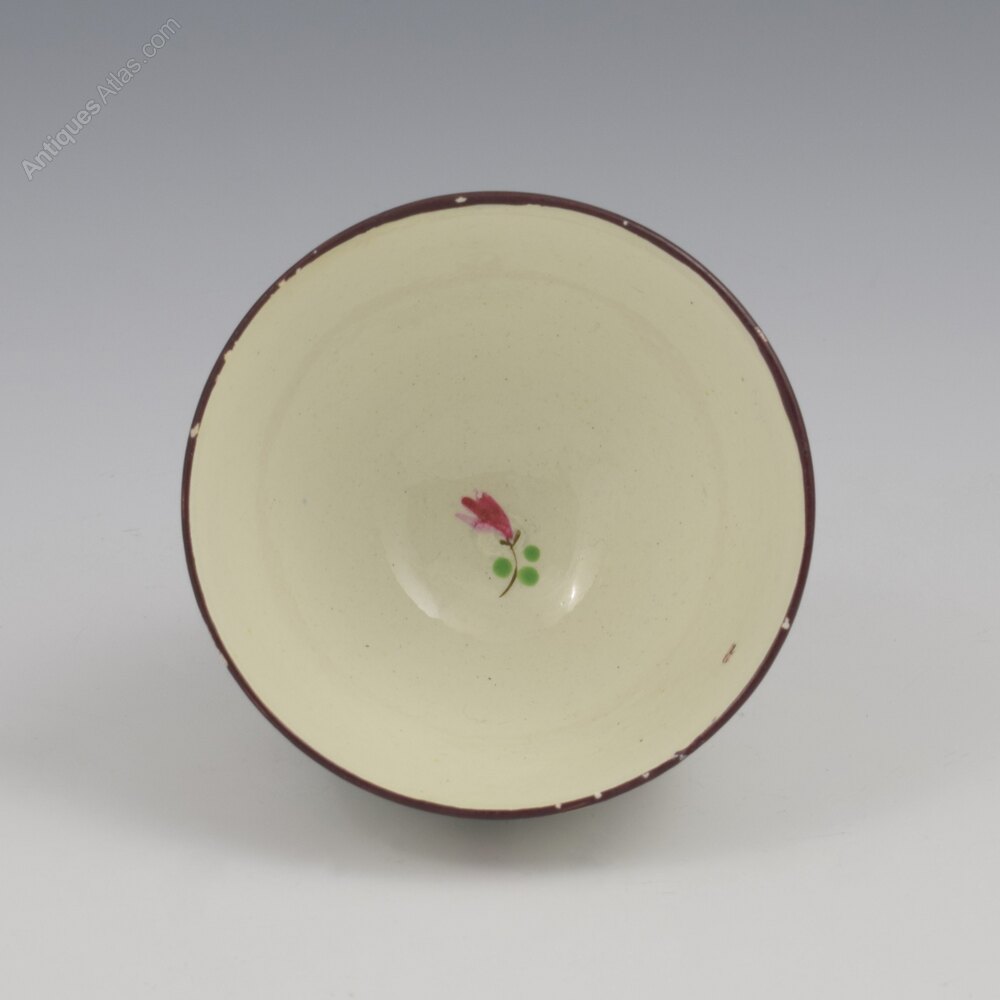 A sweet pearlware tea bowl and saucer, very finely potted, and painted with a design of stylised flowers in pink, puce, green and maroon enamel. The centre of the bowl has a further small flower and the rims are finished in a maroon enamel. c.1800.The bowl measures 7.2cm (2 13/16") wide and 4.7cm (1 13/16") high and the saucer is 11.8cm (4 5/8") wide.