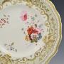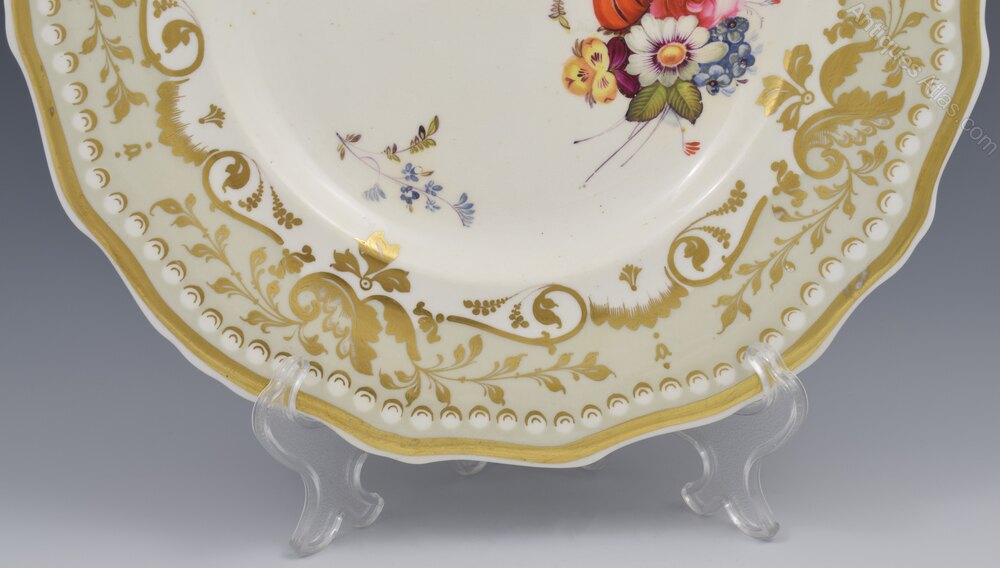 A beautiful early 19th century bone china porcelain dessert plate with unusual irregular shaped rim, quite thickly potted, with a shallow cavetto. The lip is enamelled in a pale buff/grey enamel reserving white circles tracking inside the rim that are cleverly made to resemble pearls with gilt highlighting. The enamel ground is over gilded with a stylised vine, acanthus leaves, scrolls and grapes or floral buds. The shaped central reserve is exquisitely painted with garden flowers in bright enamels. A wide gilt band is loosely painted just inside the rim. Believed to be Minton, c.1830.It measures 23.5cm (9 3/4") wide and 2cm (3/4") high.