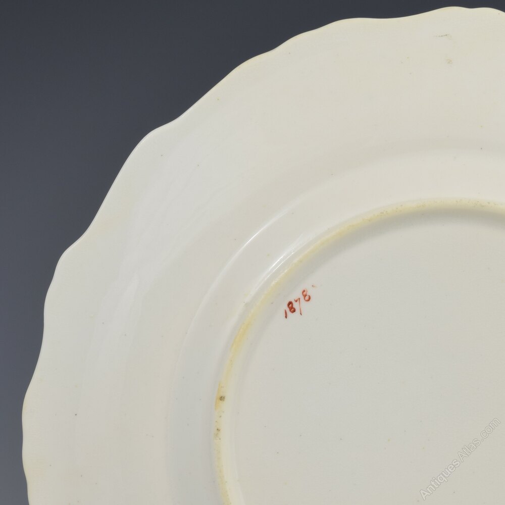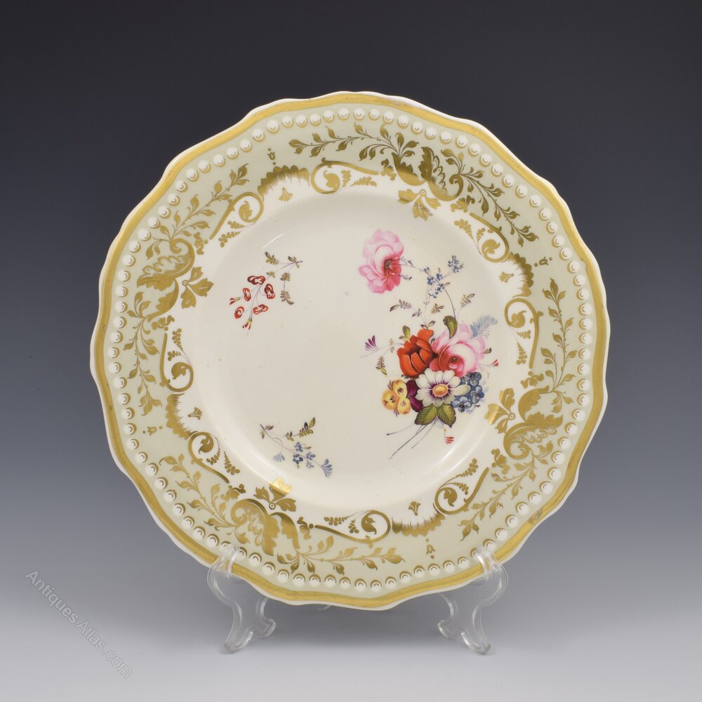 The Minton tablewares of the 1820s and 1830s are little documented and the pattern book covering this period isn't available. However, the date ranges have been established from factory documents and this pattern would date to c.1830 which matches the period of this plate. This highly distinctive shaped rim and the way the gilt band is applied inside the rim appears identical to documented Minton cups and saucers of the period and some printed tablewares, along with the heavier style potting and colour of the porcelain. Extensive research shows that this shape is not found at any of the other potters of the time and the pattern number doesn't fit with that of any other manufacturer for this date period.