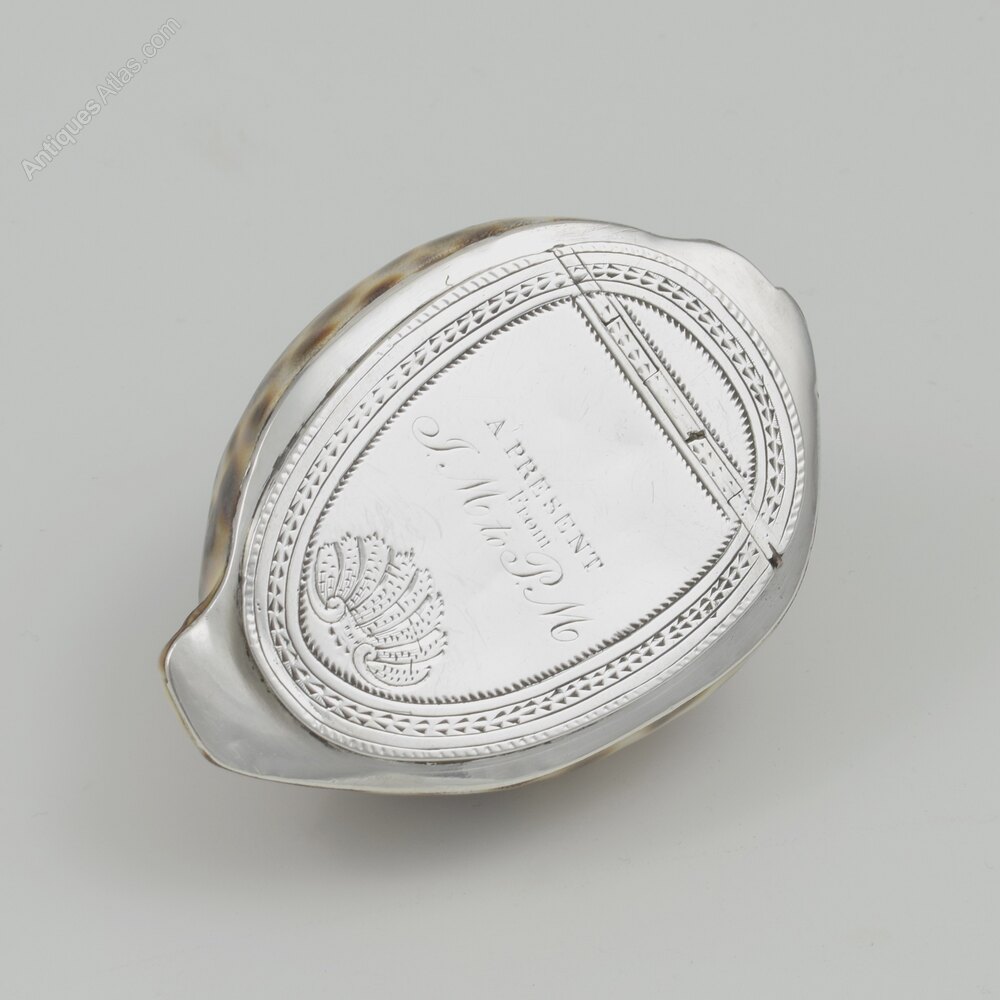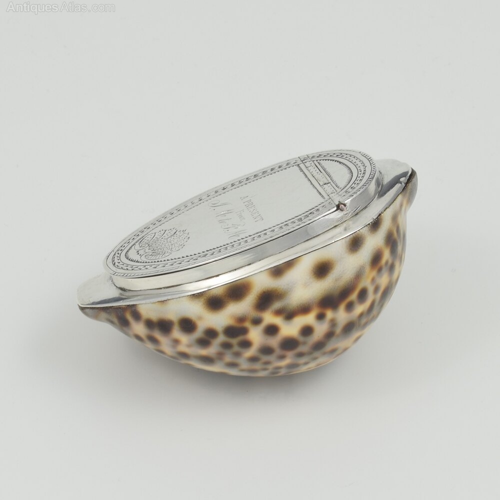 A superb quality George III snuff box formed from a whole cowrie shell fitted with a bespoke silver mount and hinged cover with concealed flush hinge. The silver is beautifully decorated with bright cut engraved borders and a detailed scallop shell at the bottom. A contemporary engraved dedication "A present from J.M. to P.M." The silver is unmarked as is common. c.1800.It measures 8.5cm (3 3/8") long, 6cm (2 3/8") wide and 4.2cm (1 5/8") high.