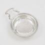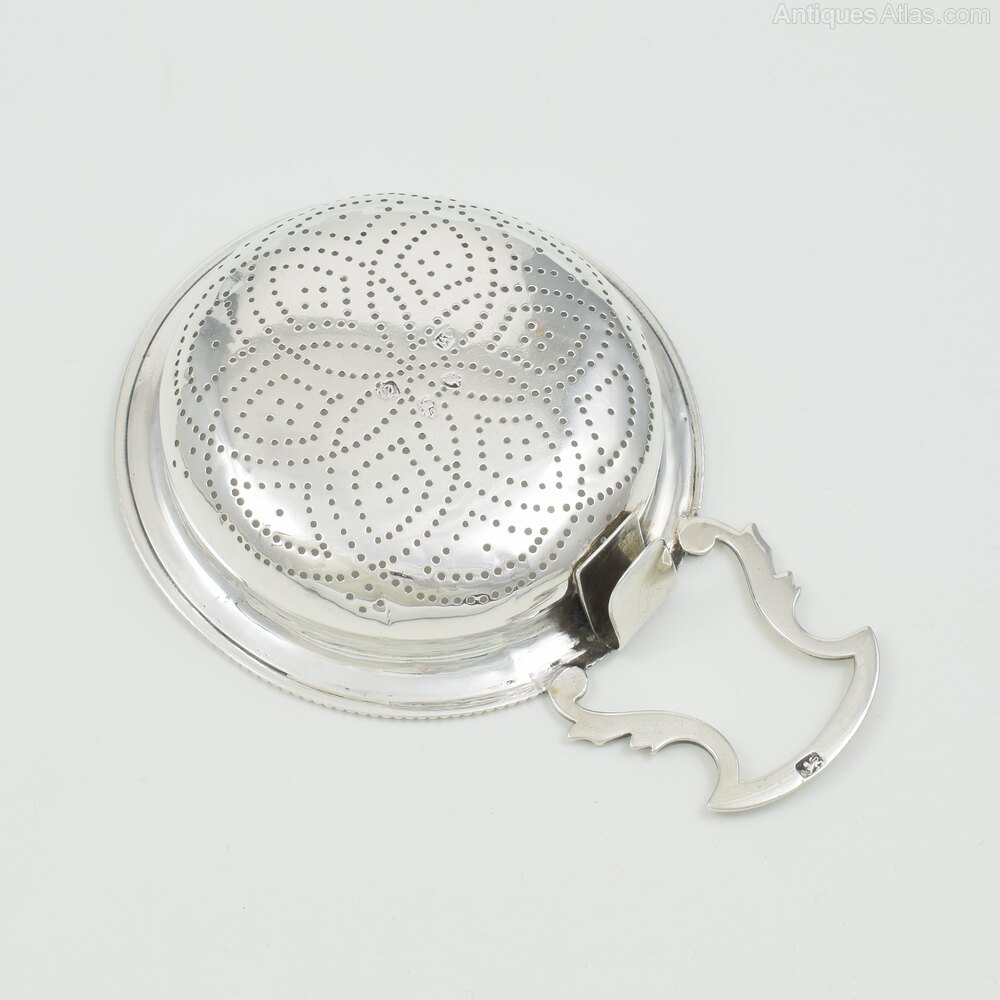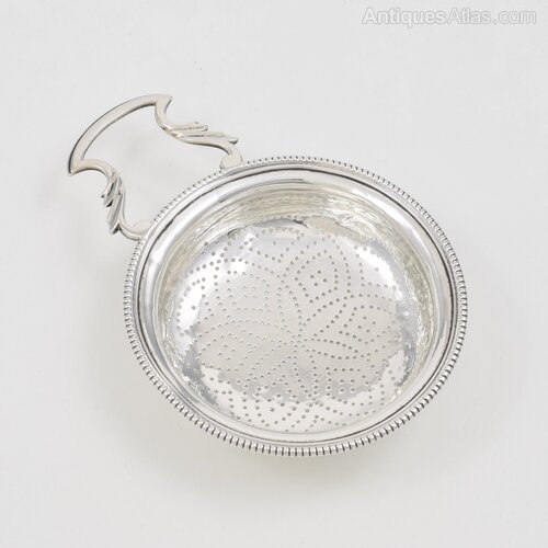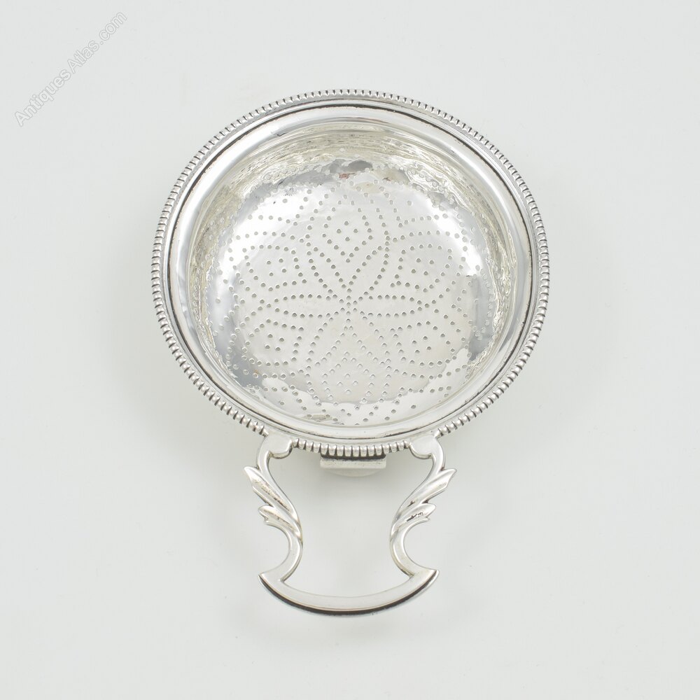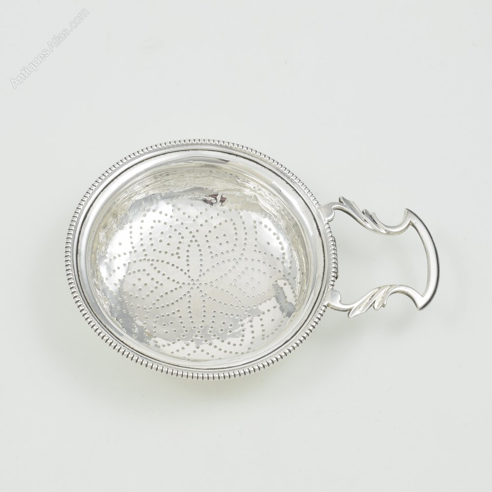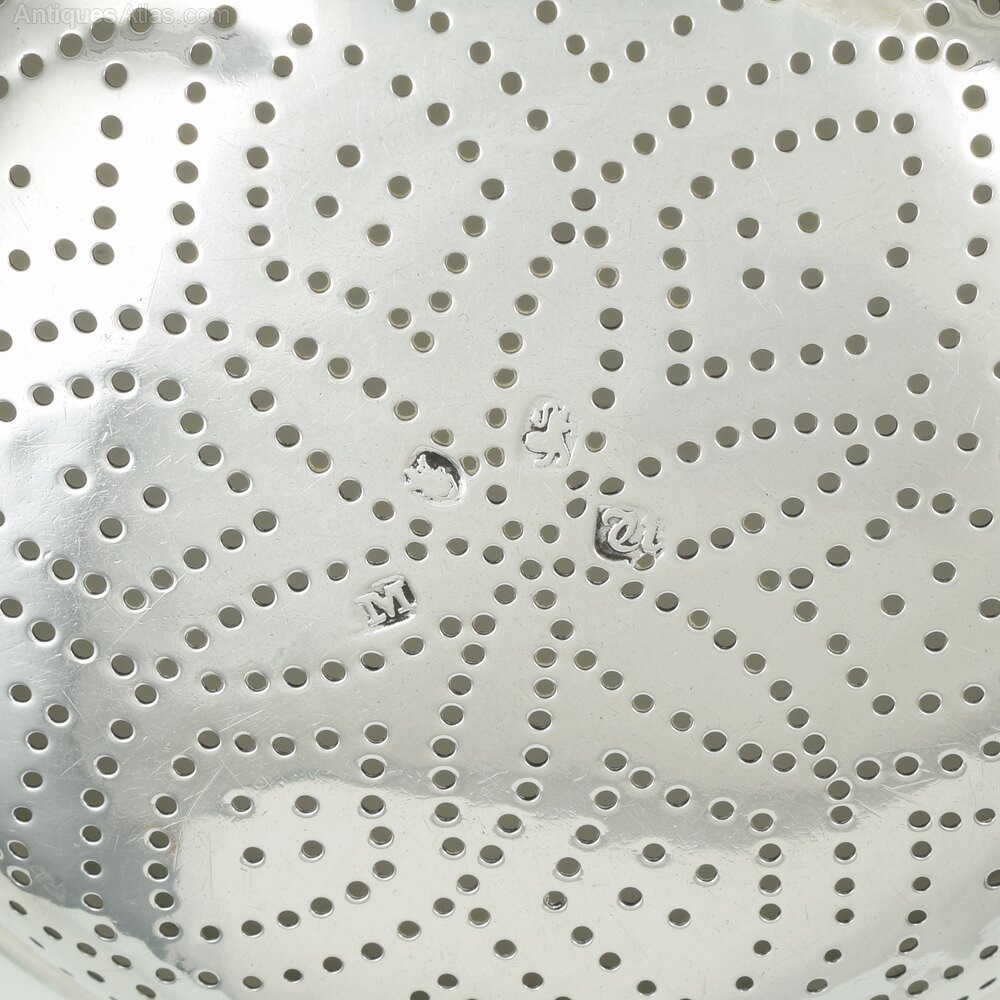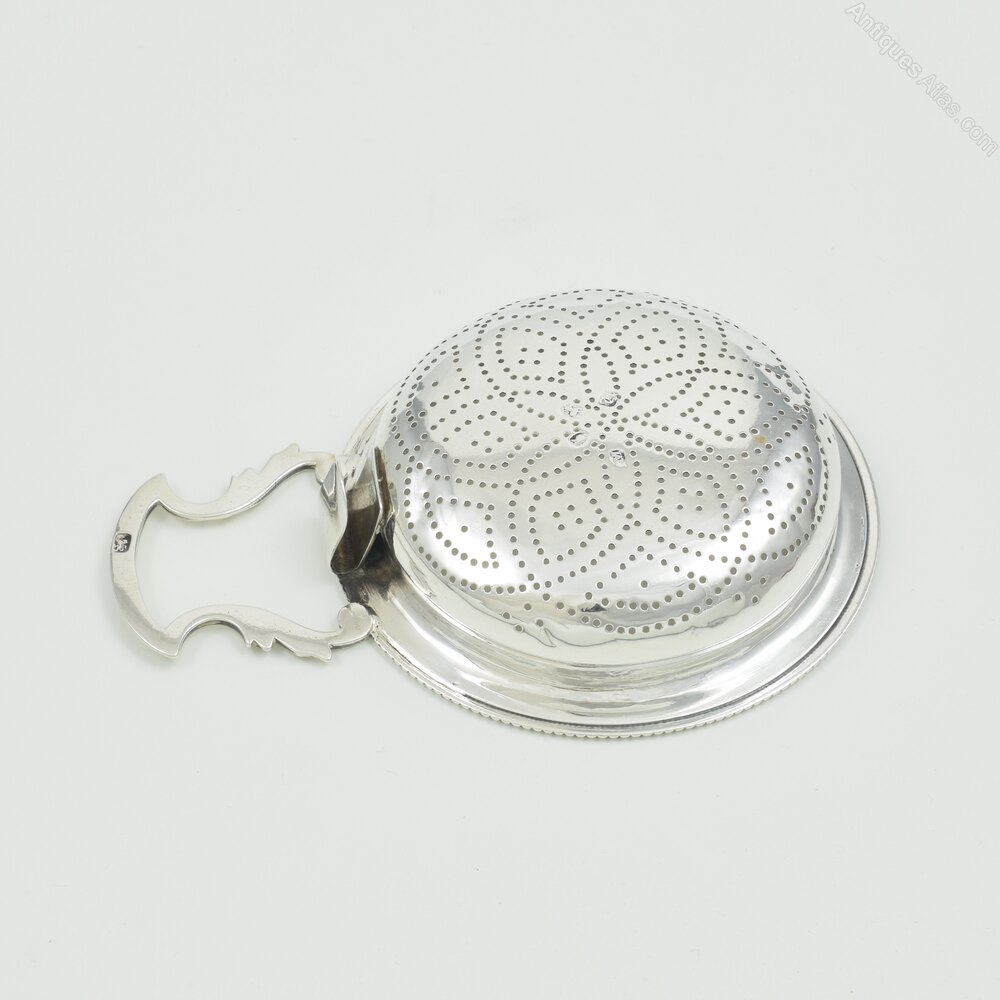 A superb 18th century silver single handled lemon strainer, designed to drain the juice from cut fruit into punches, keeping pips and other debris behind. It has a clip on the edge to sit on the rim of a bowl or cup. A nicely cast beaded rim and shaped rococo style handle, and a particularly fine arrangement of pierced holes. Hallmarked to the underside for London 1775, the maker initials partially rubbed, "?M" possibly for Benjamin Mountigue (Mordecai). Lion passant mark to the handle.It measures 9.3cm (3 11/16") rim to rim, 13.2cm (5 3/16") handle to rim and 2.3cm (78") high. It weighs 60g / 1.9ozt.