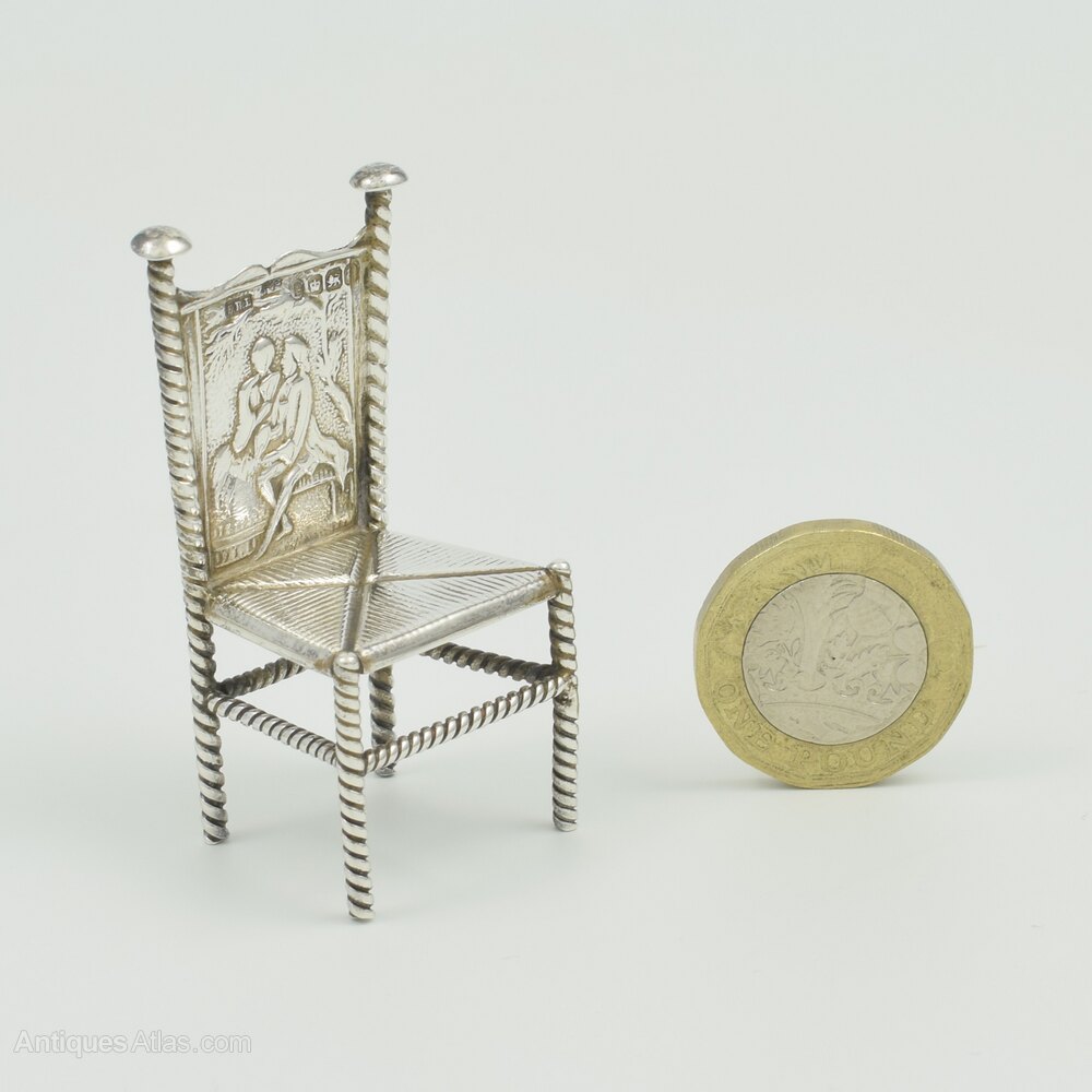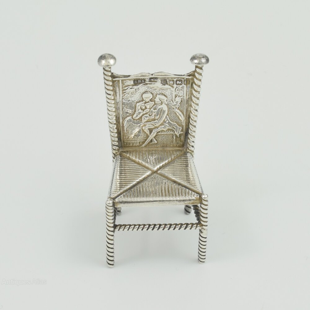A nicely made Dutch silver miniature dining chair with barley twist legs, stretchers and back frame. An imitation rush seat and the back panel embossed with a romantic scene of a courting couple, him seated on a bench and her standing with a fan held to her face. Dutch export mark to the back panel and full English import marks for Sheffield 1893, importer Samuel Boyce Landeck. There are also a set of pseudo/fantasy marks to the base.It measures 5.3cm (2 1/8") high, 2.5cm (1") wide and 2.2cm (7/8") deep and weighs 14g / 0.5ozt.