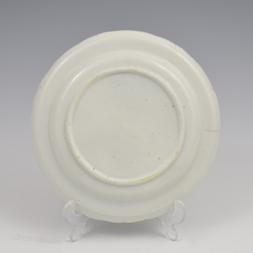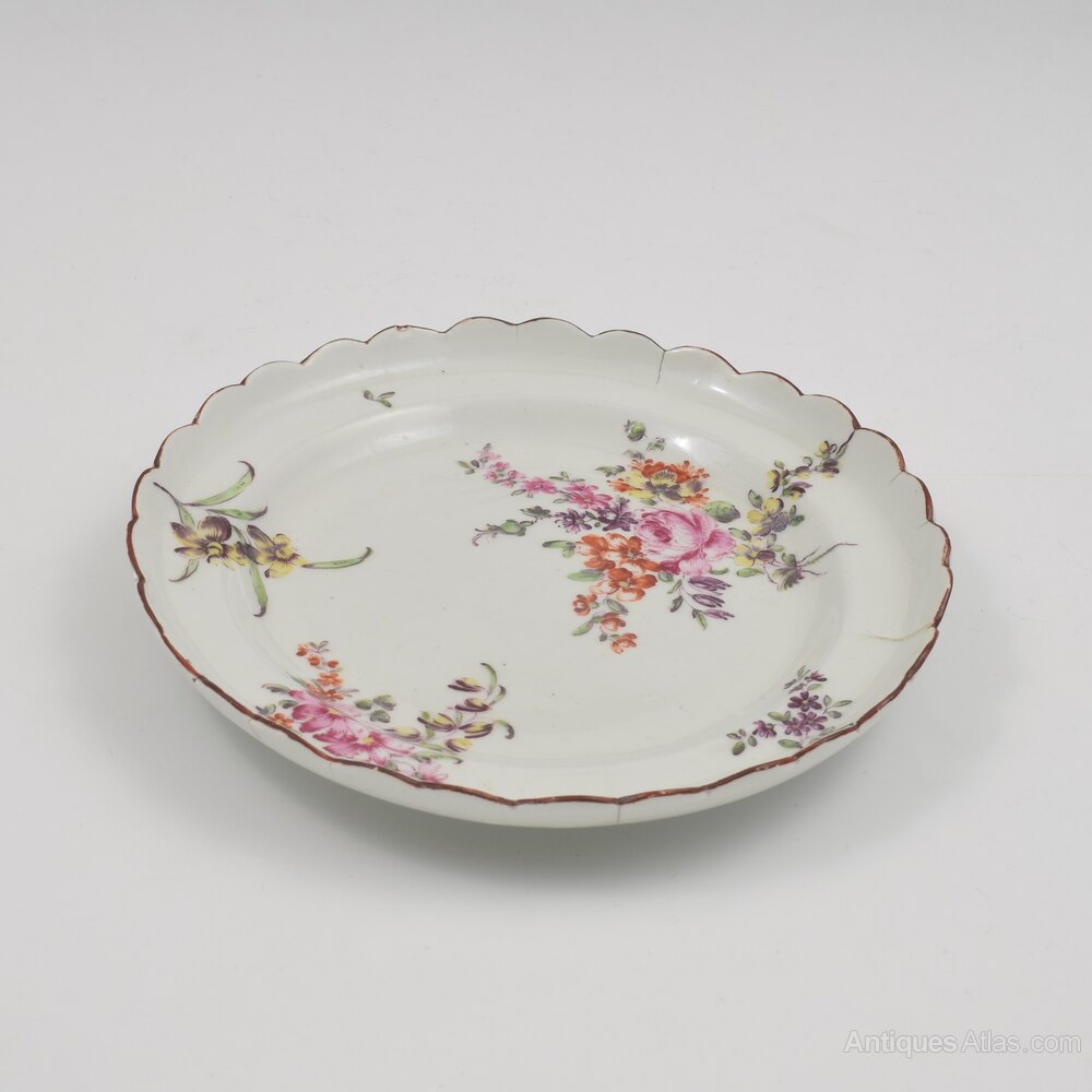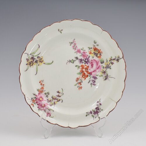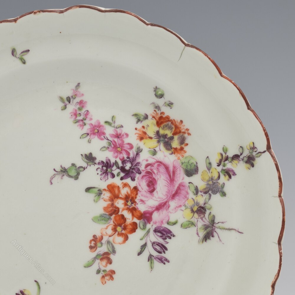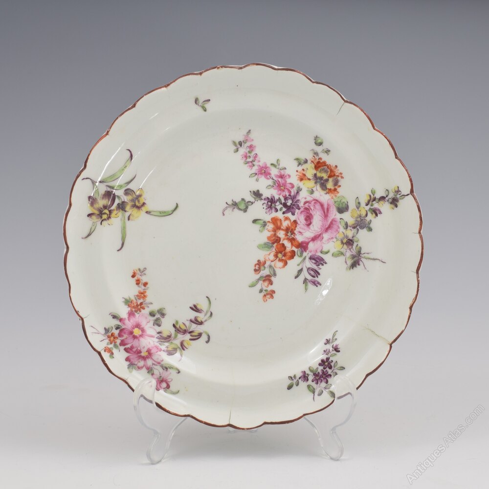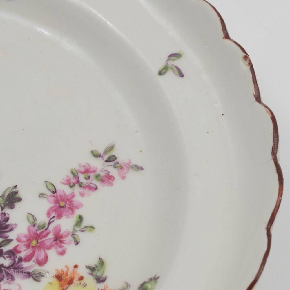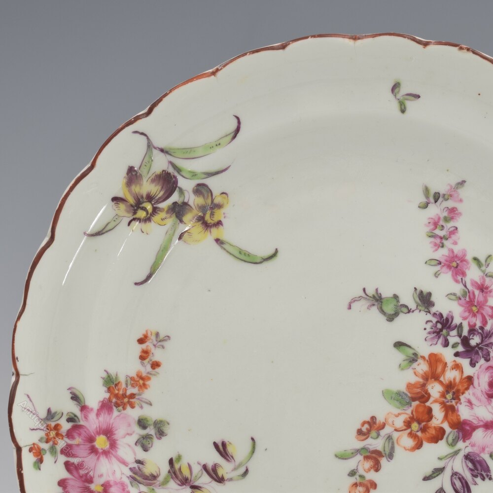 A very lovely early Derby porcelain plate/dish of unusual shape with curved, raised scalloped rim and double stepped cavetto. Beautifully painted with finely detailed ornate floral sprays by the "cotton-stem painter" and finished with a brown-red rim. Unmarked, c.1760-1765.Provenance: Dennis G. Rice Collection.