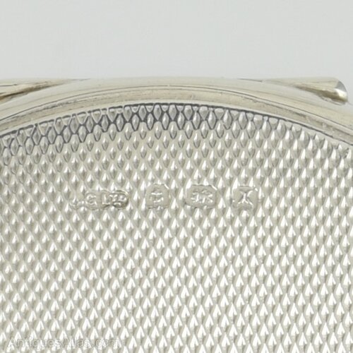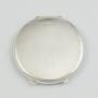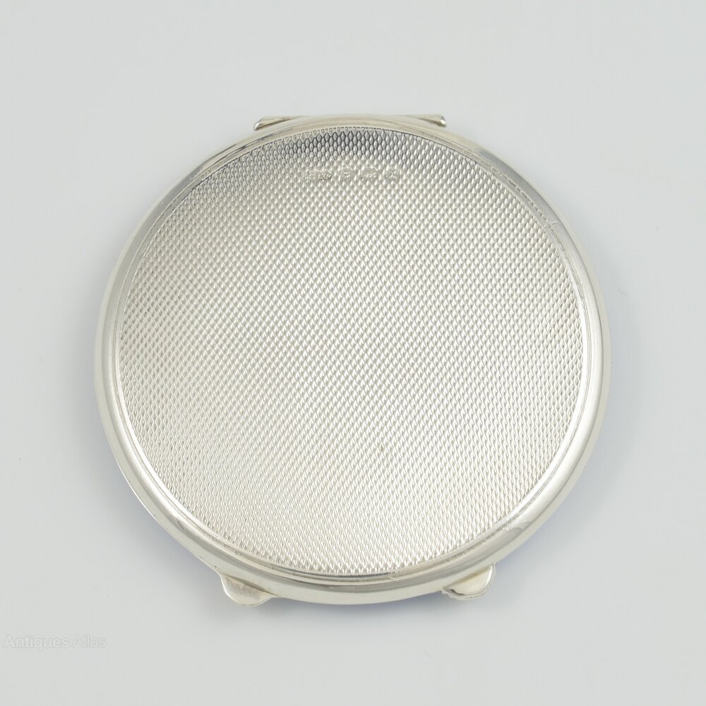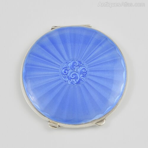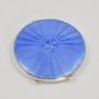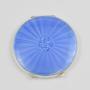 A fine vintage silver powder compact with a stunning sky blue guilloche enamel with a sunburst design radiating from a central boss of ornate scrolled acanthus leaves. Fitted with a mirror to the inside and a new powder puff, ready for use. Hallmarked for 1947, maker Joseph Gloster Ltd.It measures 6.7cm (2 5/8") wide excluding the clasp lugs.