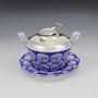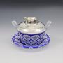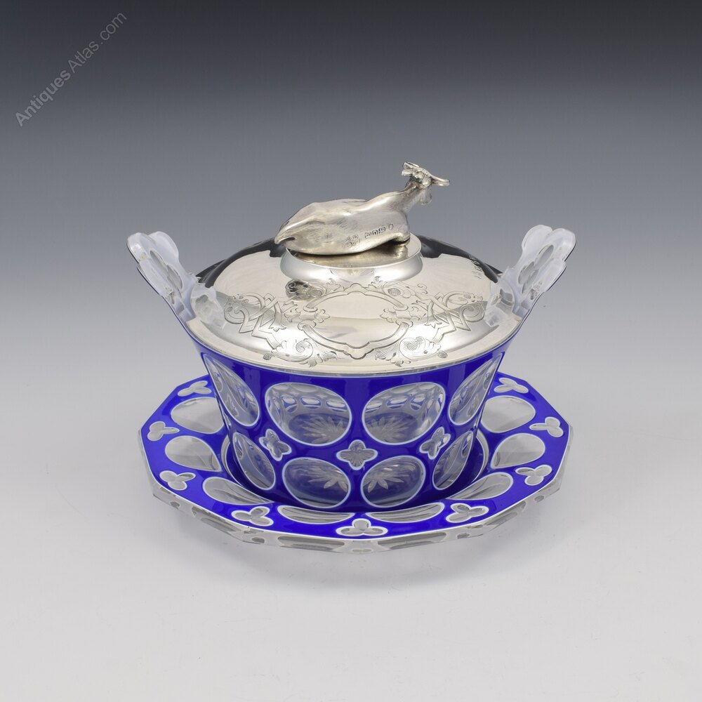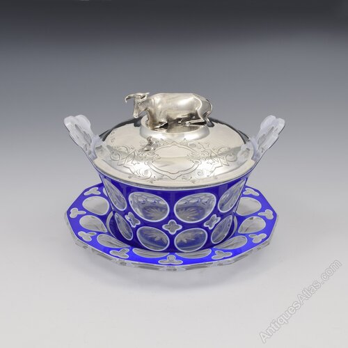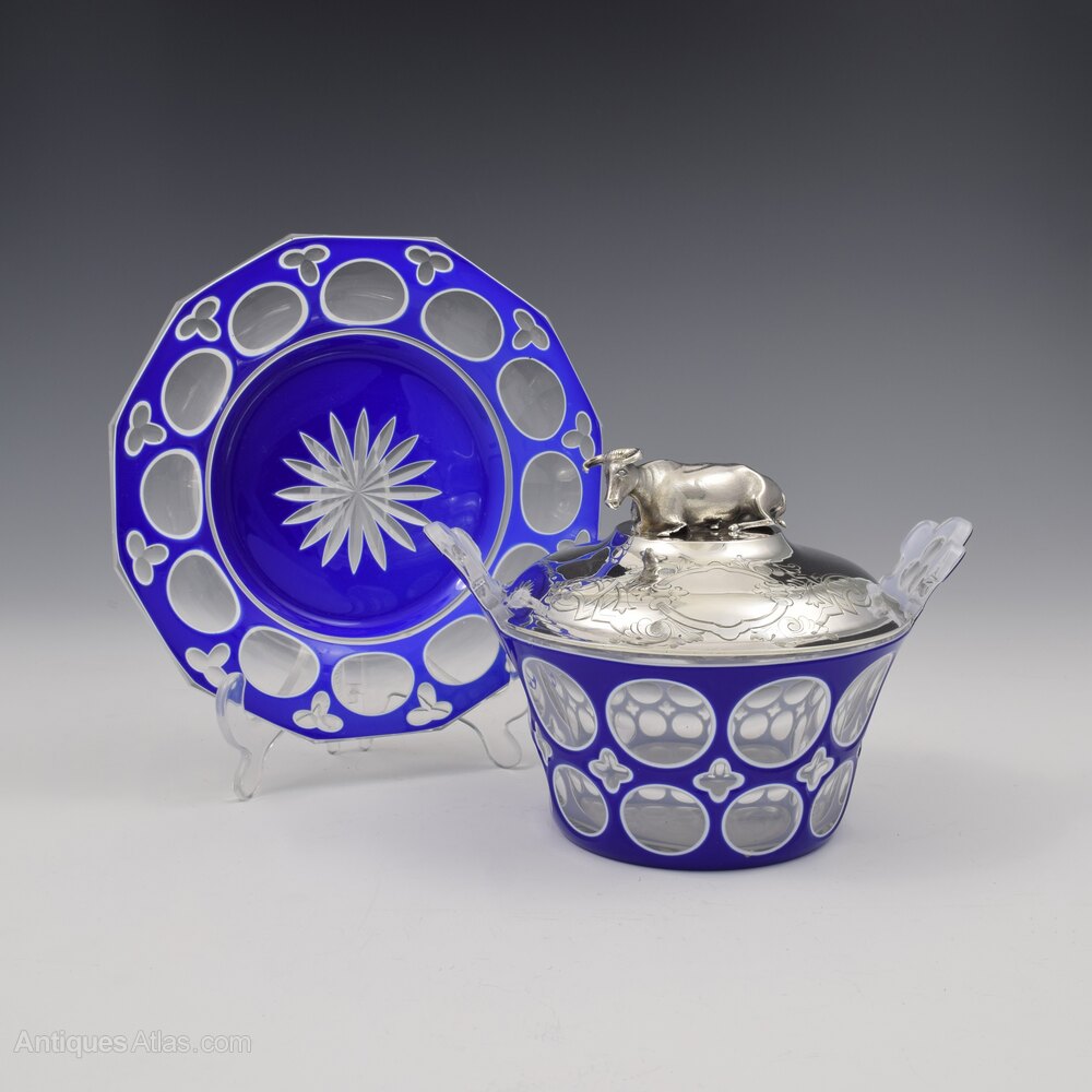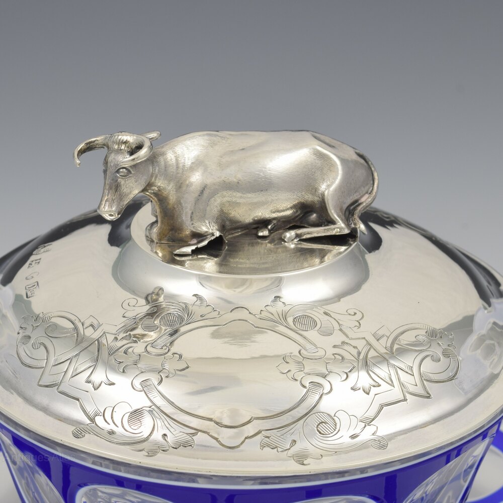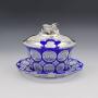 A superb quality mid-19th century cut glass butter dish and stand, with double layered white and blue overlay, cut-to-clear in a pattern of large circles and quatrefoil and trefoil shapes. The stand with star cut centre and the tub with raised trefoil shaped lug side handles. The domed cover is sterling silver with engraved decoration to both sides framing a pair of vacant cartouches and topped with a beautifully cast recumbent silver cow. Both cover and cow have a full set of matching hallmarks for Sheffield 1847, makers Hawksworth, Eyre & Co.It measures 11.5cm (4 1/2") high. The stand is 16cm (6 1/4") wide and the tub is 12cm (5 3/4") rim to rim and 15.6cm (6 1/8") across the handles.