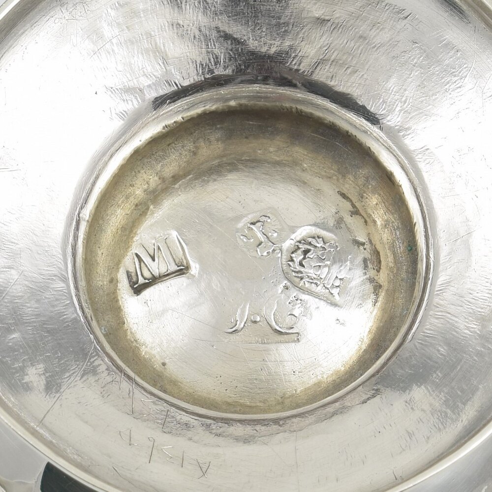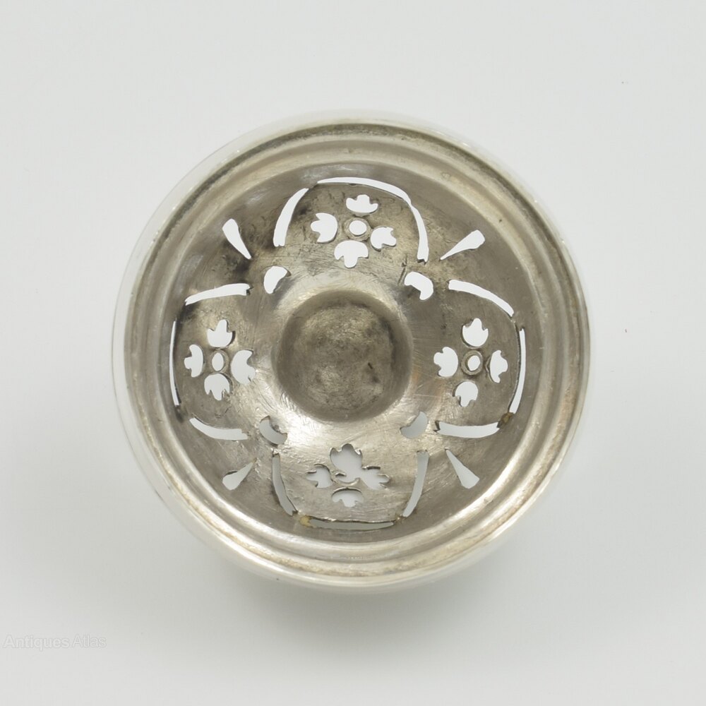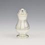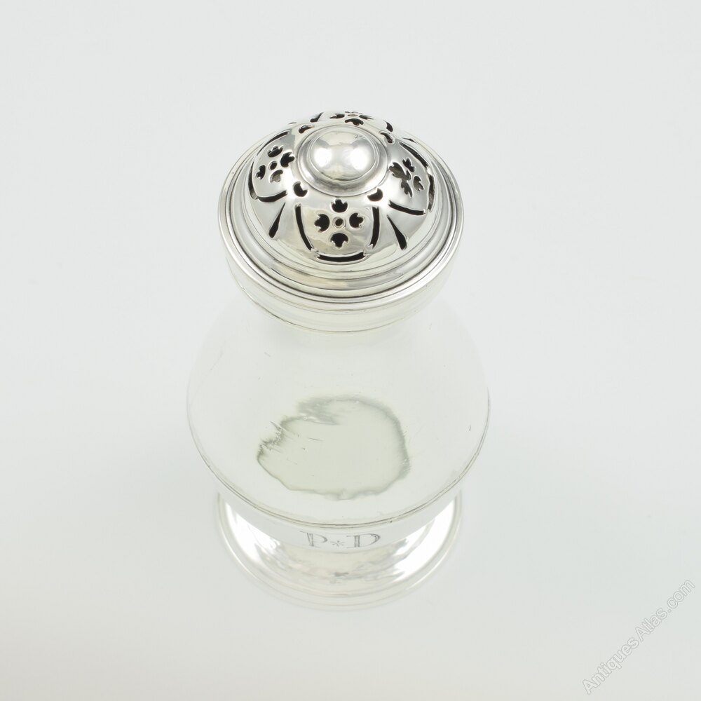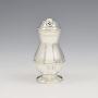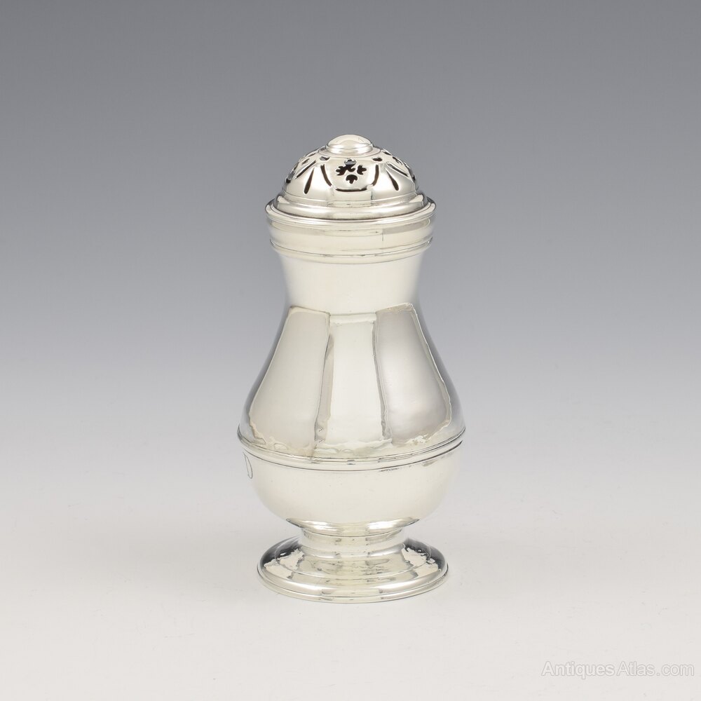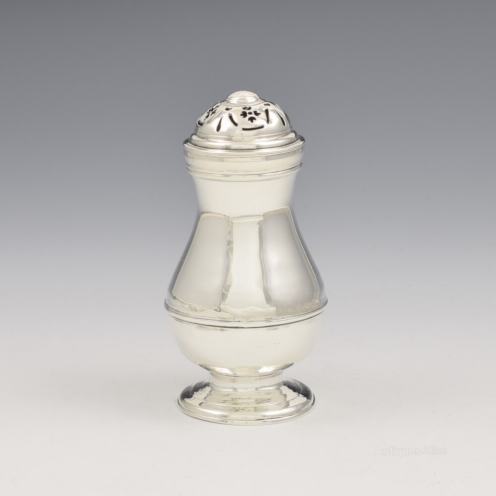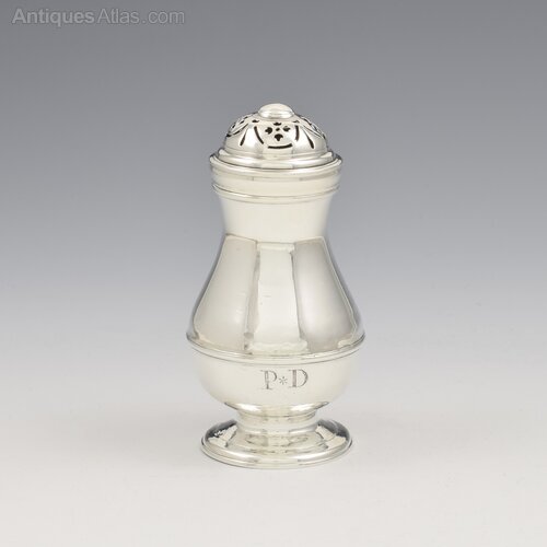 A charming early Georgian silver pounce pot of baluster shape with reeded detail to the body, foot and rim. The push on domed cover has a stepped edge and button finial with pretty hand pierced holes of flower shapes, curves and droplets. The original owner's initials PD are engraved to the belly. Hallmarked to the base for London 1727, maker James Goodwin, the cover is unmarked as usual.It measures 9.5cm (3 3/4") high and 4.5cm (1 3/4") wide and weighs 64g / 2.1ozt.