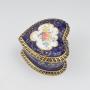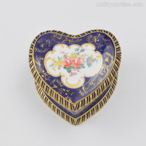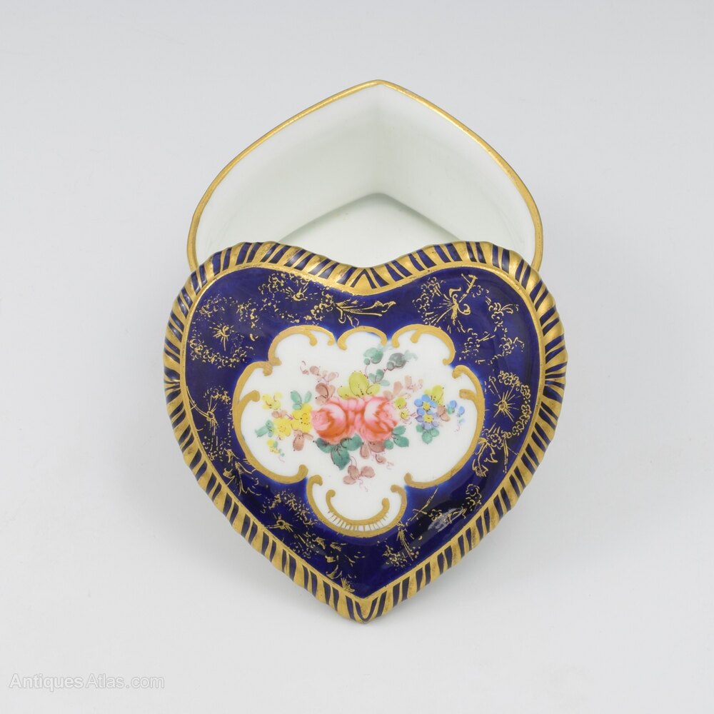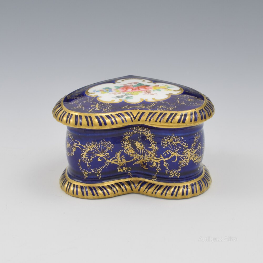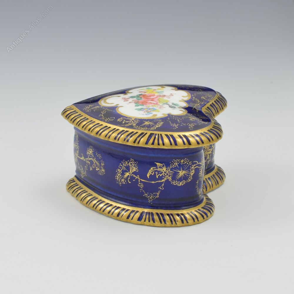A stunning and rare Royal Crown Derby Edwardian fine bone china porcelain heart shaped trinket / jewellery box and cover. Curved, fluted walls with gadrooned moulding to the foot and cover edge. Covered in a rich underglaze mazarine blue ground, very finely hand gilded with delicate, scattered dandelion clocks. The cover has a shaped reserve, framed with gilt scrolls, and painted with pink roses, forget-me-nots, and buttercups. The gadrooned rims are carefully picked out with gilding and the box is finished with gilt rims.Factory marks to the base and underside of the cover with date cypher for 1905. Also painted with the model number 1010 and pattern number 5589.
