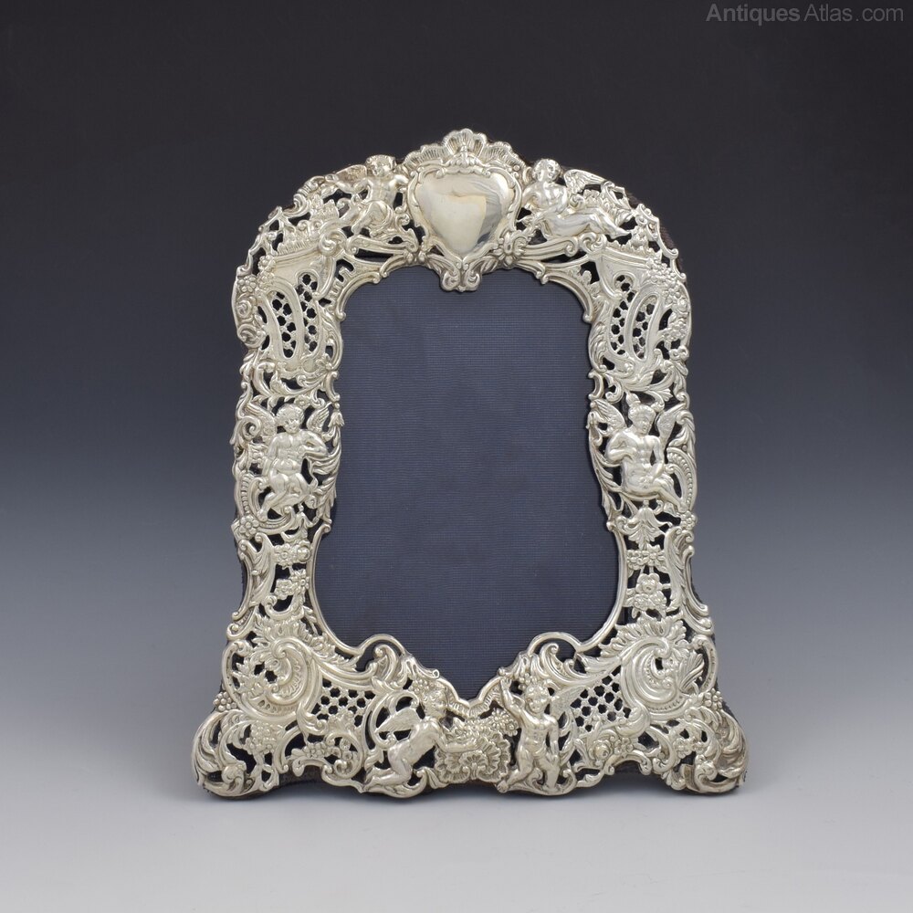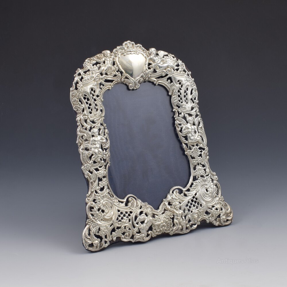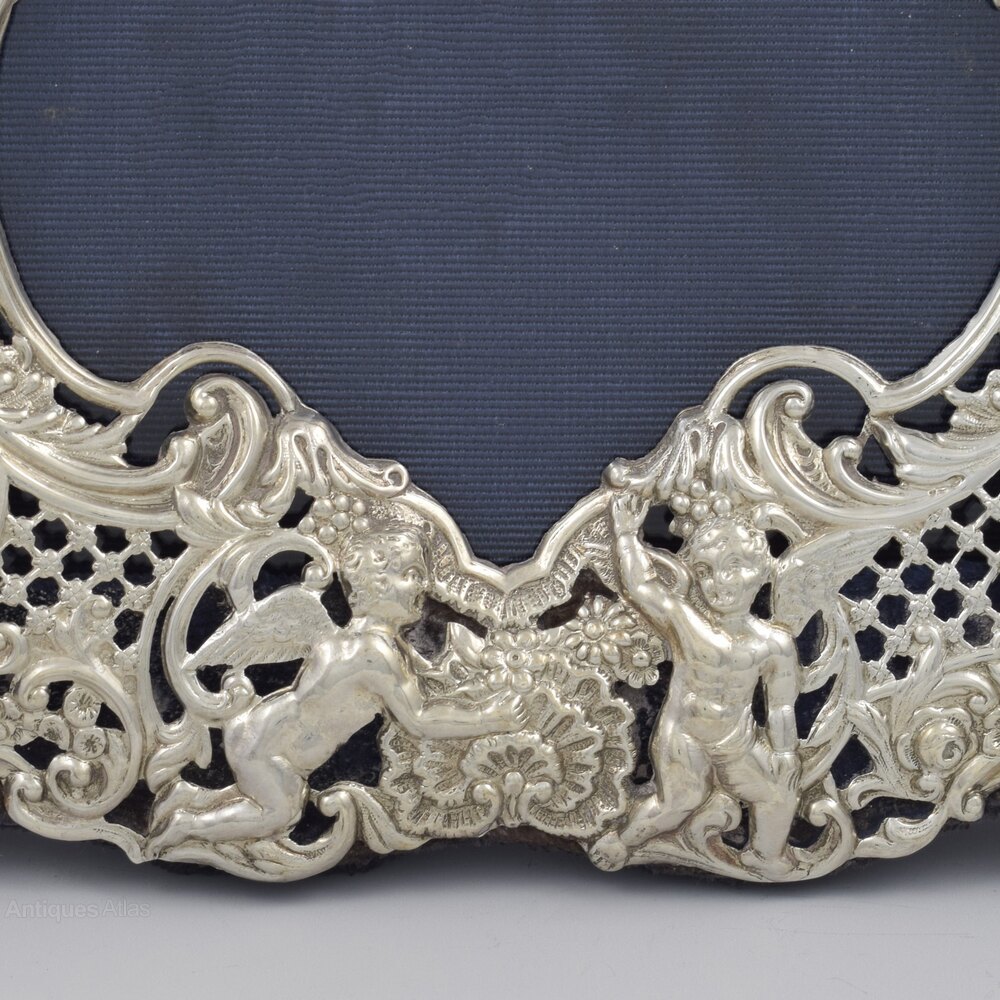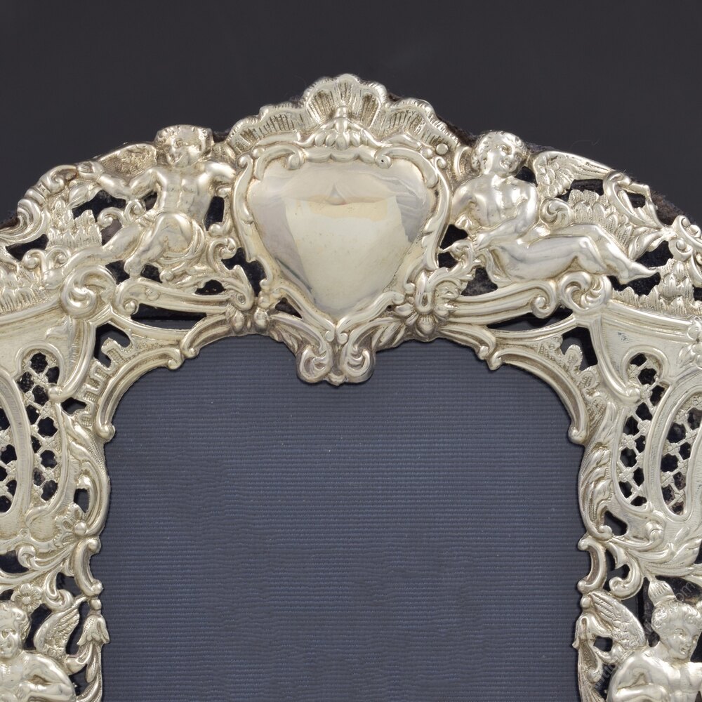 A beautiful, rococo style, sterling silver photograph frame. Embossed and pierced, with ornate scrolls, acanthus leaves, daisy flowers, shells and delicate diaper pattern panels. Six winged children cherubs, in various poses, are placed on each side, at the bottom and either side of the vacant cartouche at the top. Fitted to a blue velvet covered easel back stand. Hallmarked for London 1894, maker William Comyns & Sons.It measures 21cm (8 1/4") from top to bottom and 17.5cm (6 7/8") wide. It stands 19.6cm (7 3/4") high and 10.1cm (4") deep. The aperture measures at its widest dimensions 14cm (5 1/2") high and 9.5cm (3 3/4") wide.