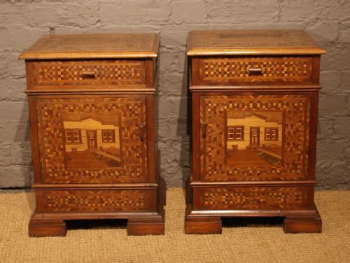 A pair of Irish provincial parquetry bedside cupboards, the doors inlaid with country scenes of crofters cottage.Date1920s :