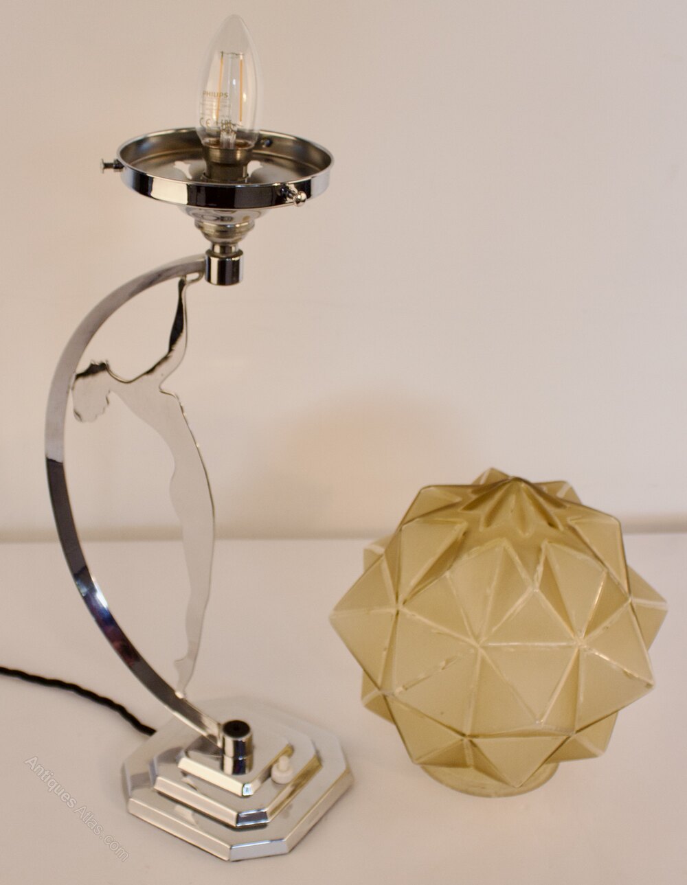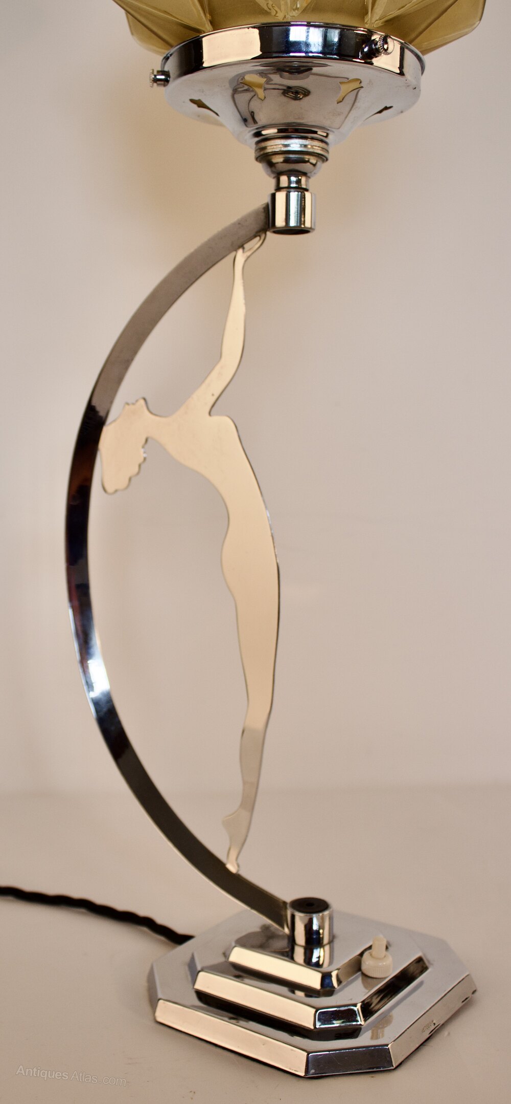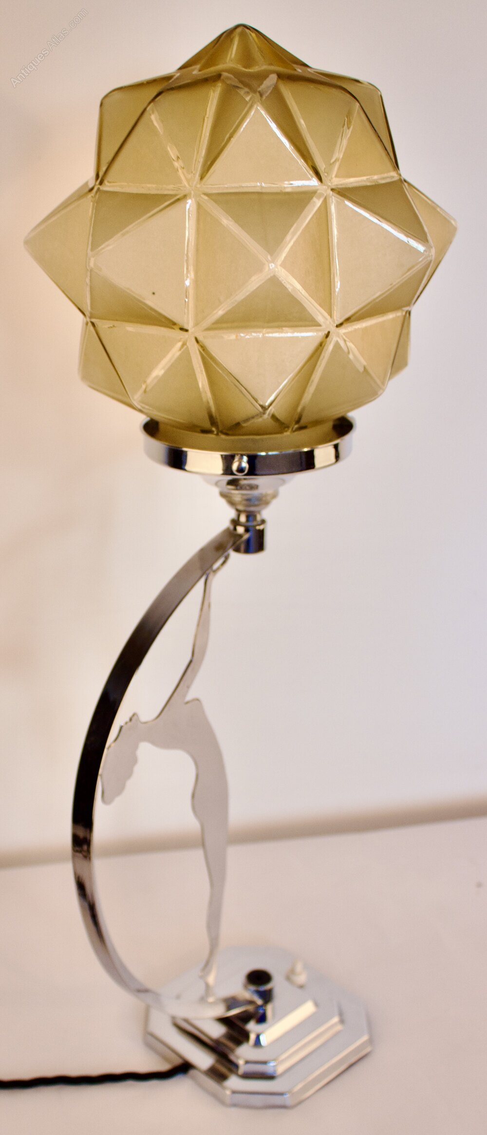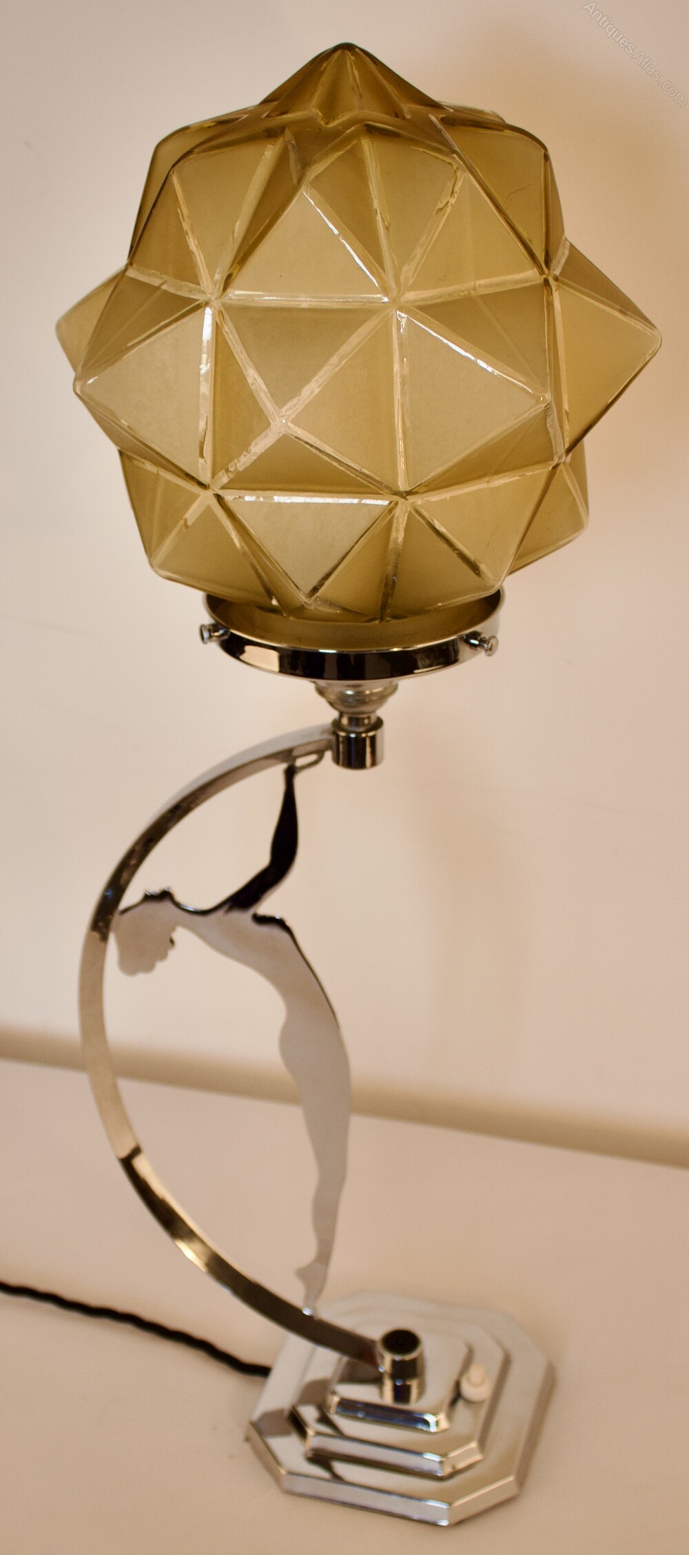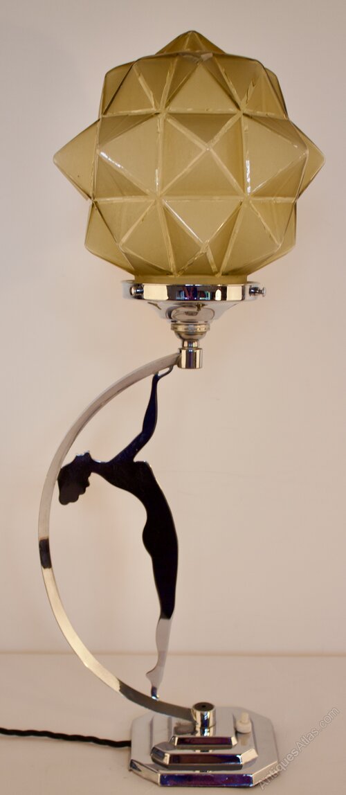 Art Deco Chrome Silhouette Lady Table Lamp with matching amber starburst shade.A superb antique chrome Art Deco table lamp with a classic silhouette lady within a semi circle complete with its original matching Walther and Sohne amber glass starbust shade.