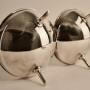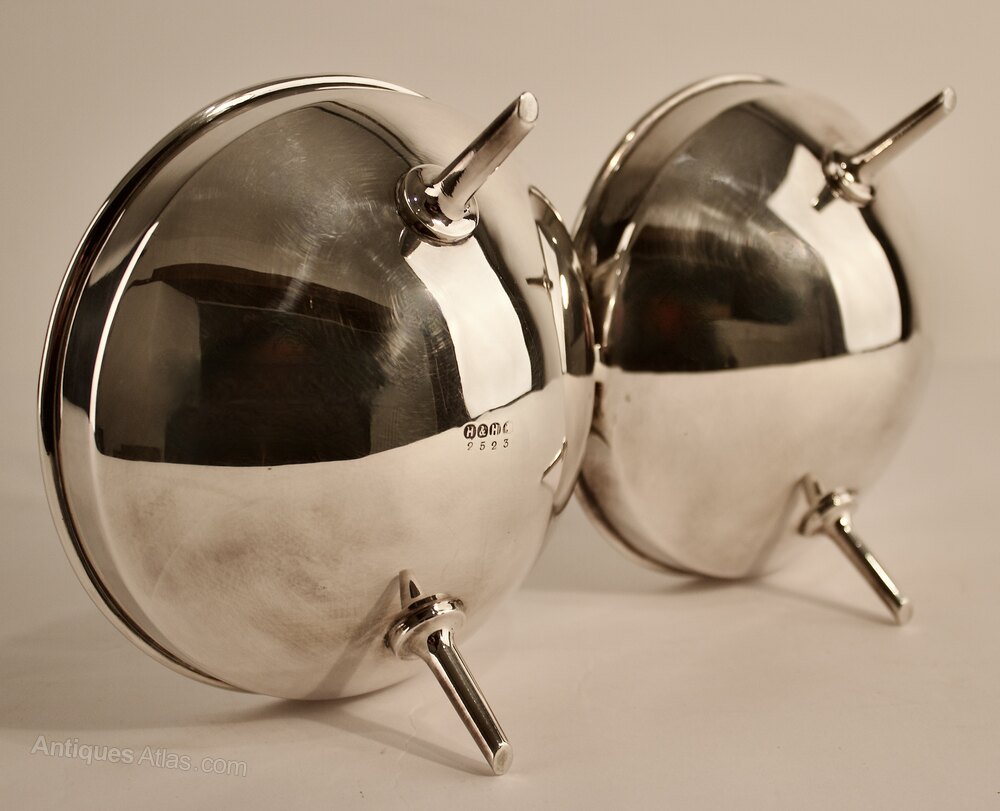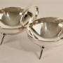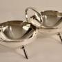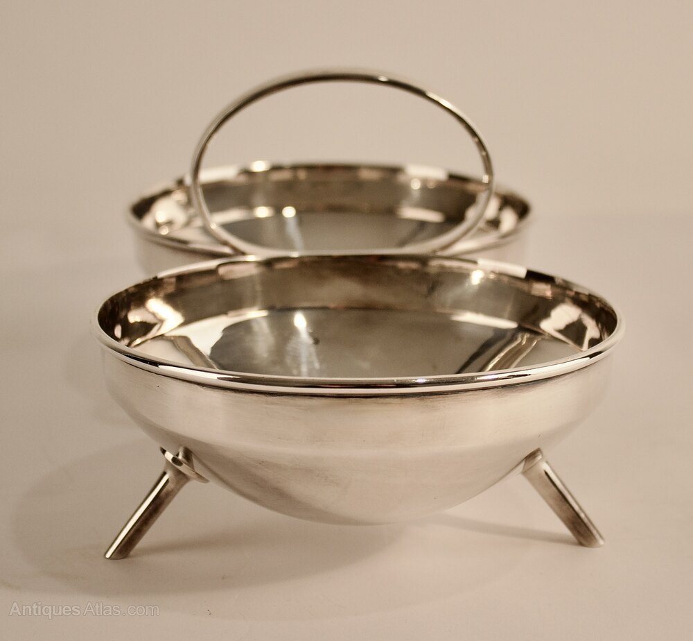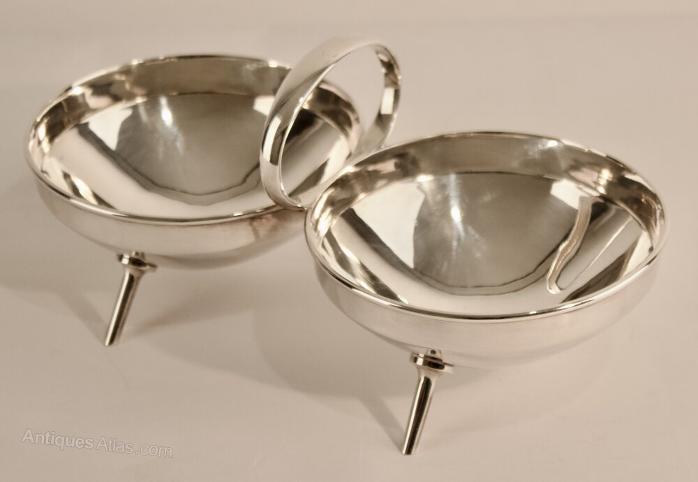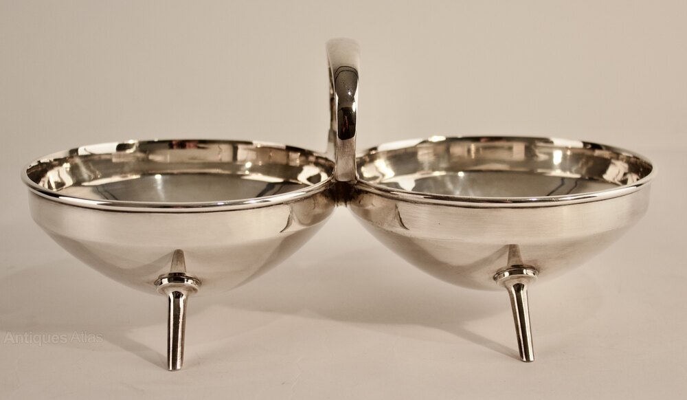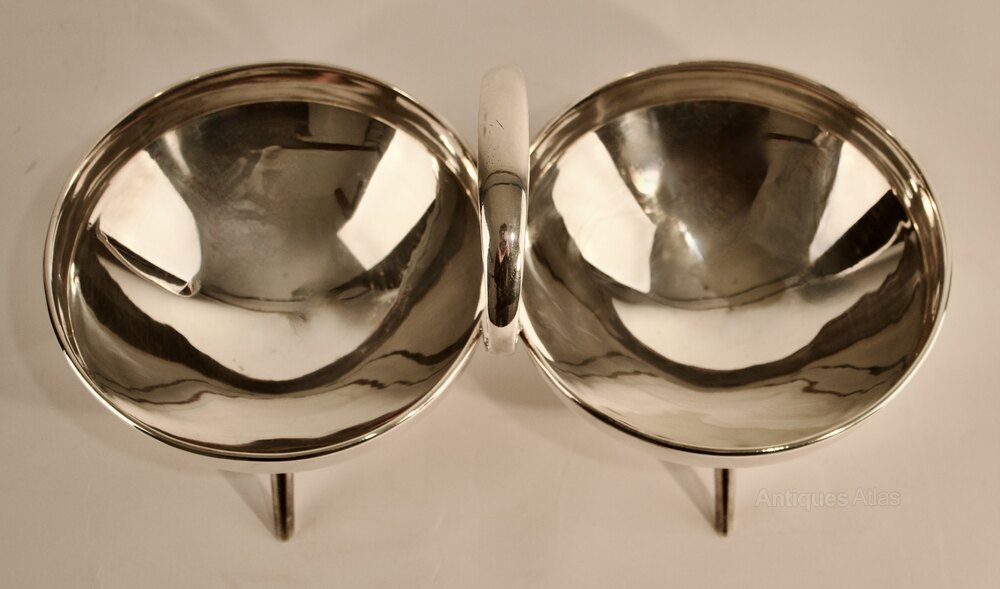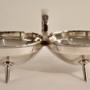 A futuristic geometric Anglo/Japanese design with twin circular bowls and central ring handle mounted on four tapering splayed spike supports.