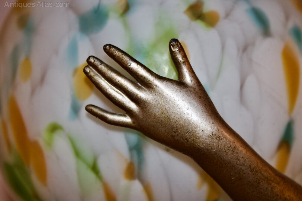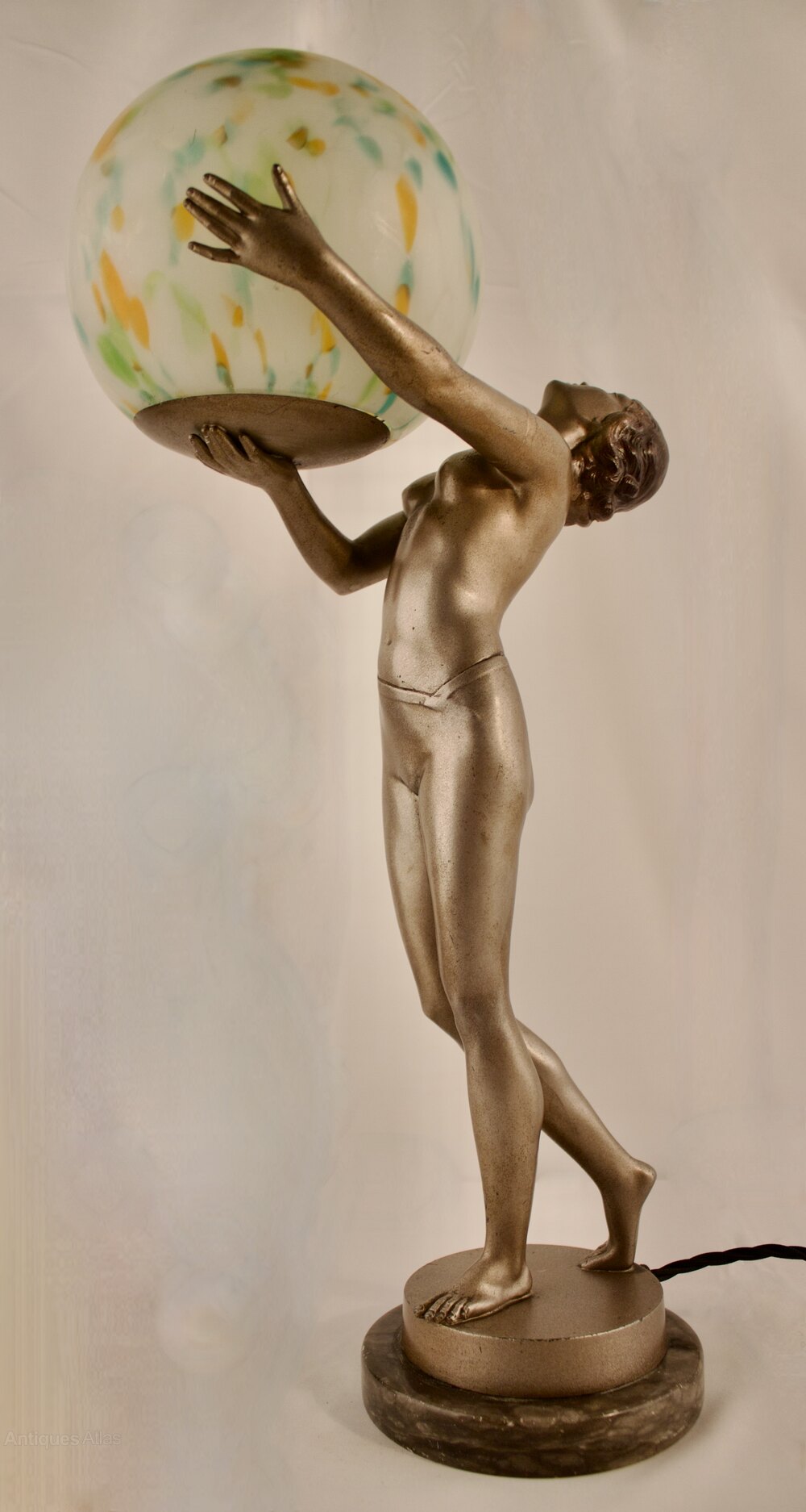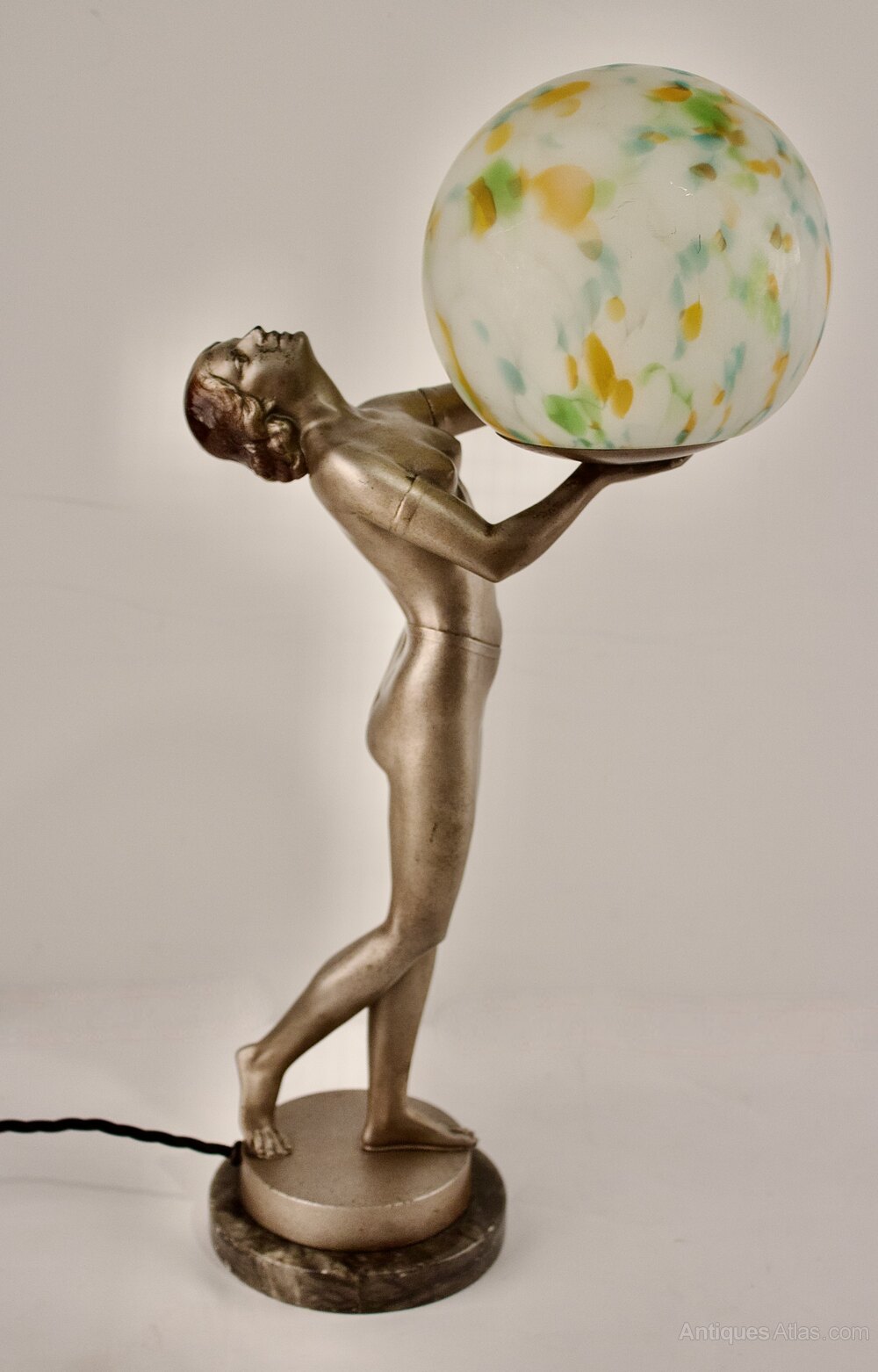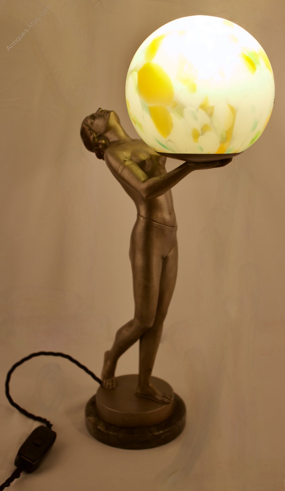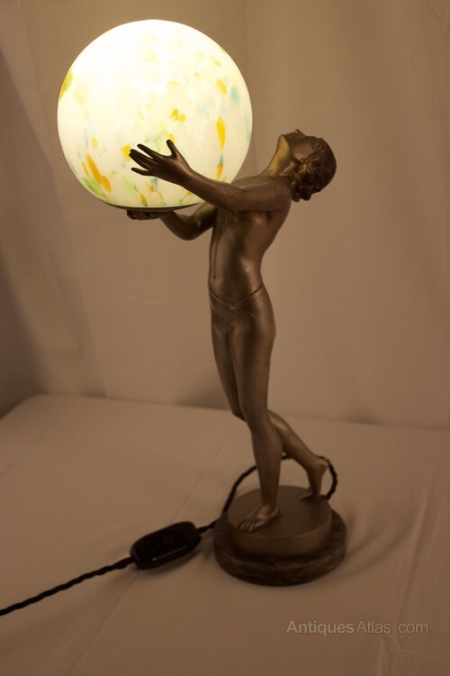 The figure is beautifully modelled with no losses or repairs particularly to her fingers which remain fully intact, the globe shade is the original to the lamp and the paintwork is in remarkably excellent condition throughout making this a scarce example.