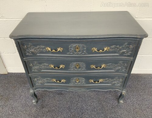 This lovely painted french chest of drawers is offered in very good condition.The chest has been painted in a farrow and ball railings, slightly shabbied and given a clear wax finish.