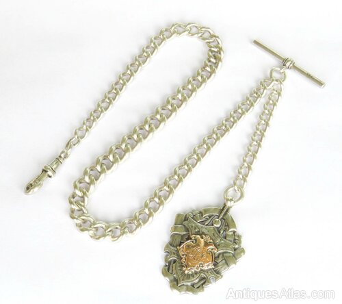 Antique silver pocket watch chain and Seaforth cricket club fob.The chain measures 35cm long including the T-bar and the clasp. Each of the links has the lion silver mark.