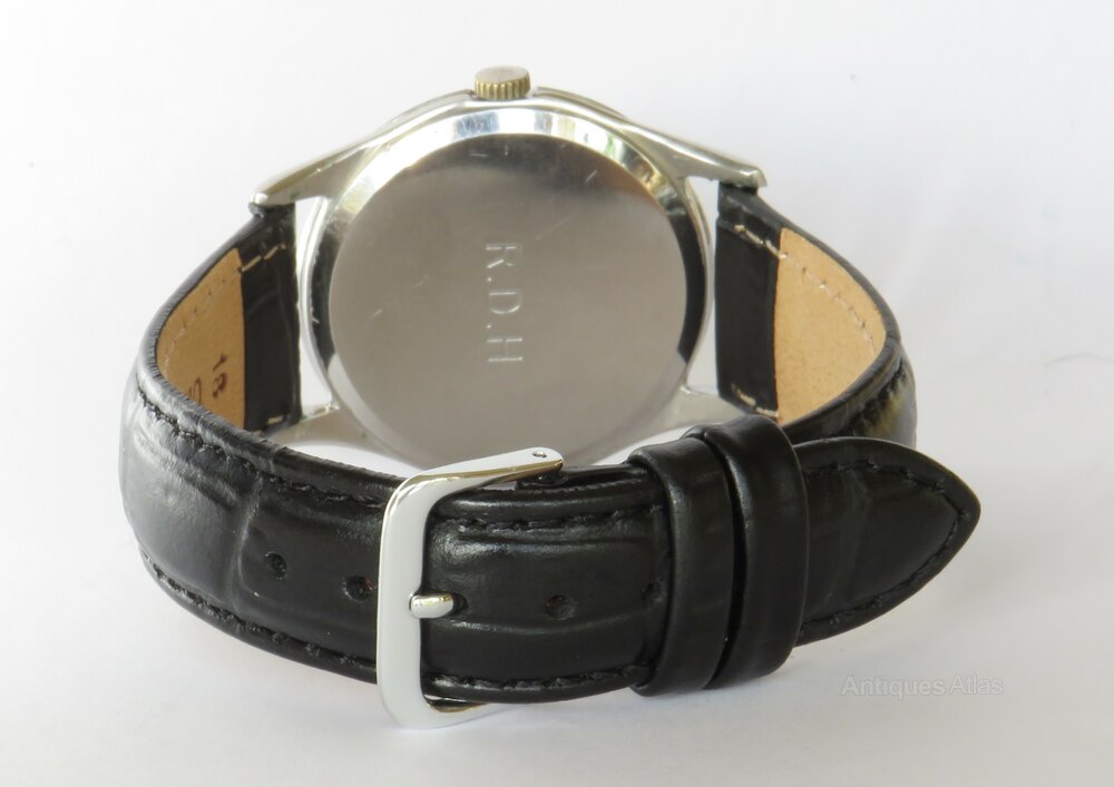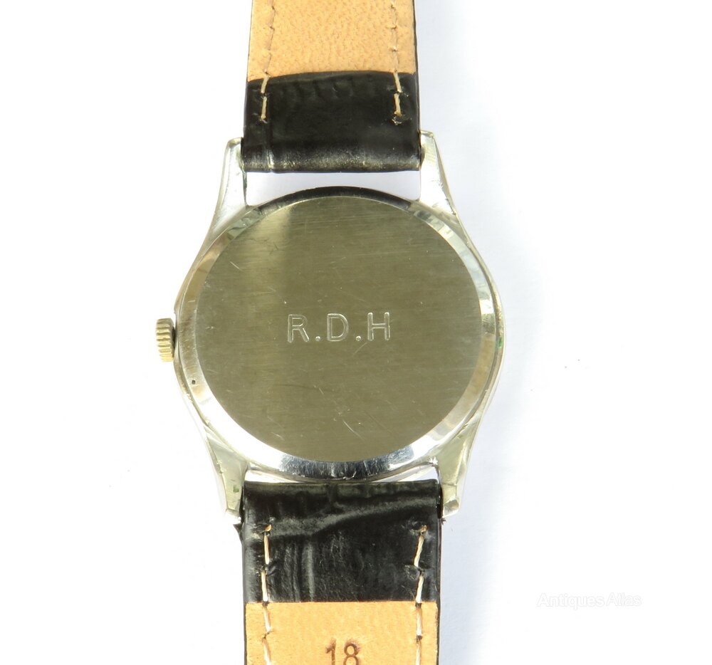 The watch measures 33mm diameter excluding the winding crown and the lugs. The case is stainless steel and it is in good condition. The back of the watch has a previous owner’s initials, RDH.