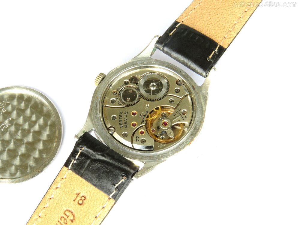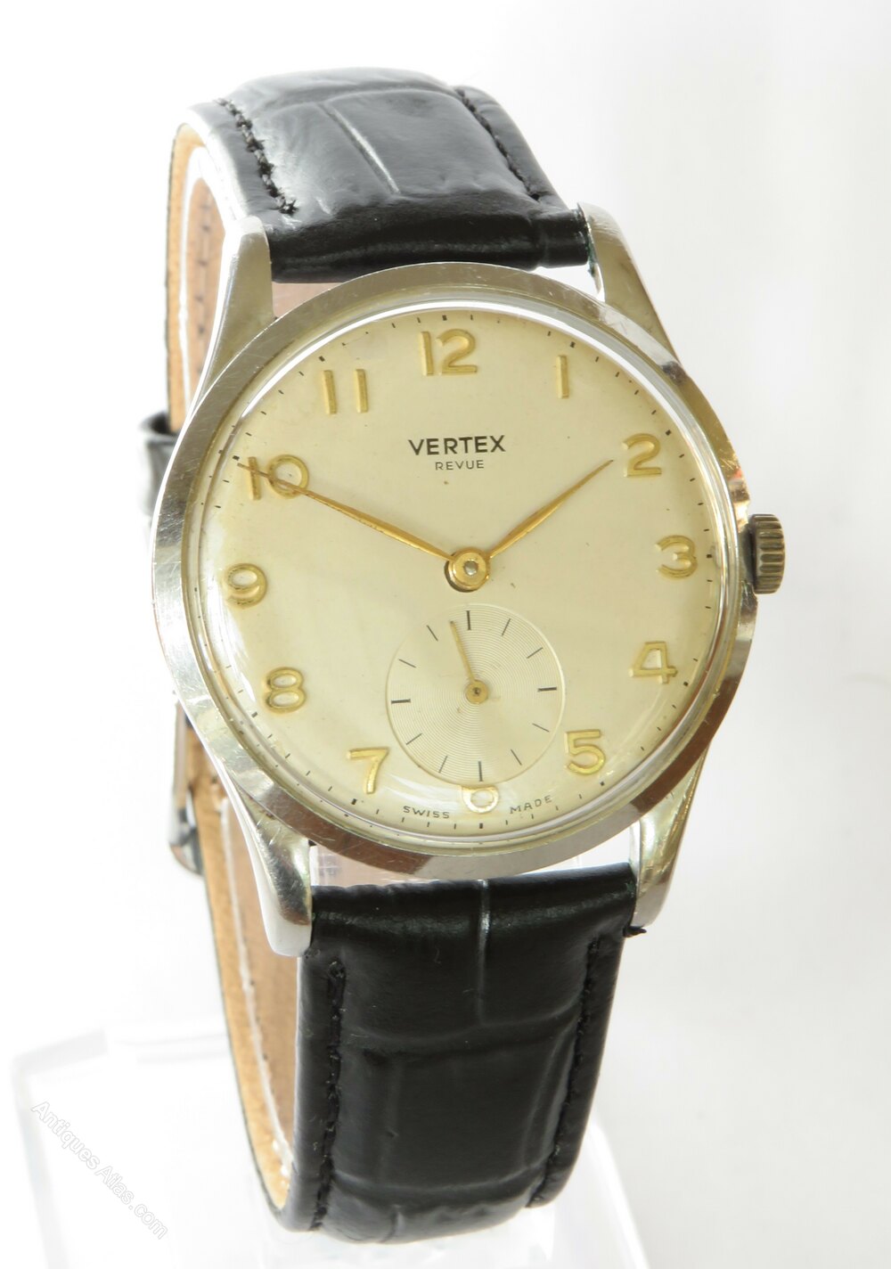 Gents 1960s Vertex wrist watch.The watch has a calibre 77 15-jewel hand-winding movement which is working nicely. The movement is signed with the Vertex Revue name together with the letters GST for Gédéon Thommen, owner of the Thommen Revue watch factory.