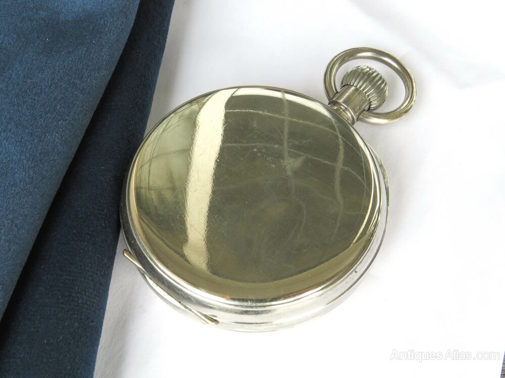 The watch measures 65.5mm diameter excluding the winding stem and the loop, so larger than a standard 50mm pocket watch. The case is nickel. The front and sides are in good condition, the back of the watch has an indentation.