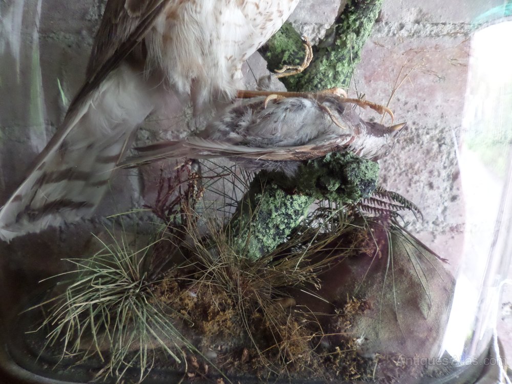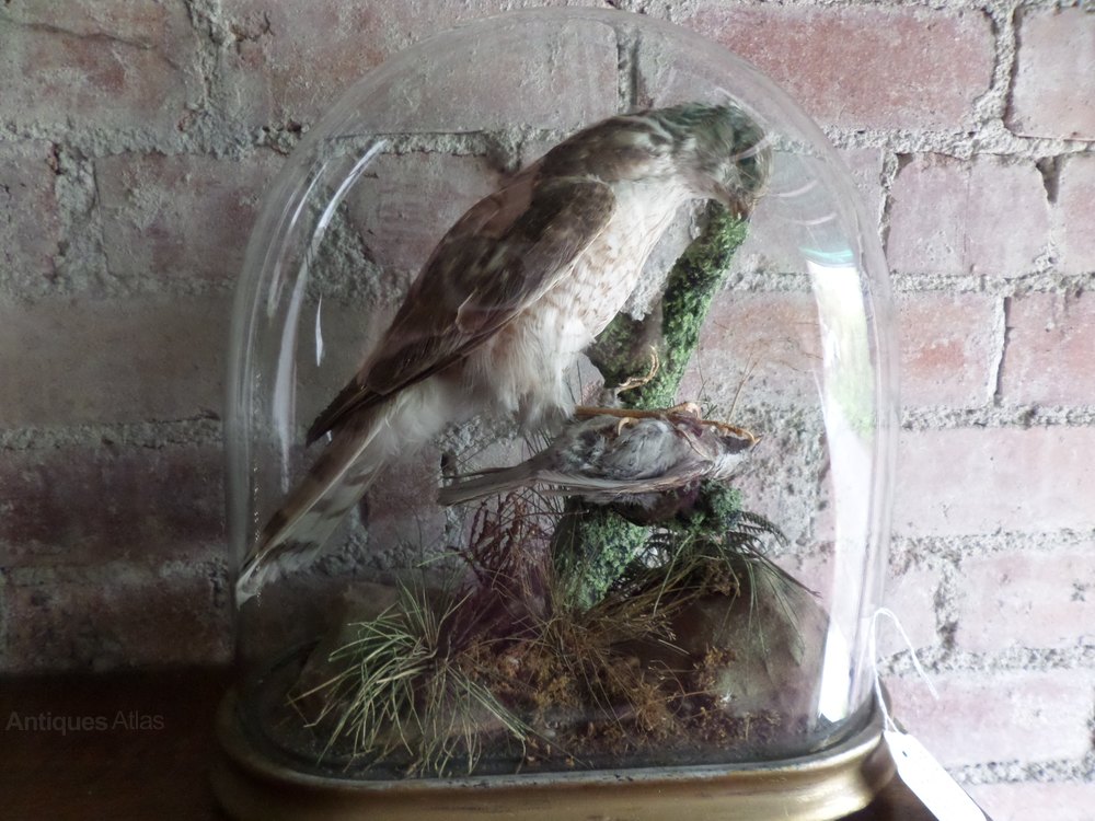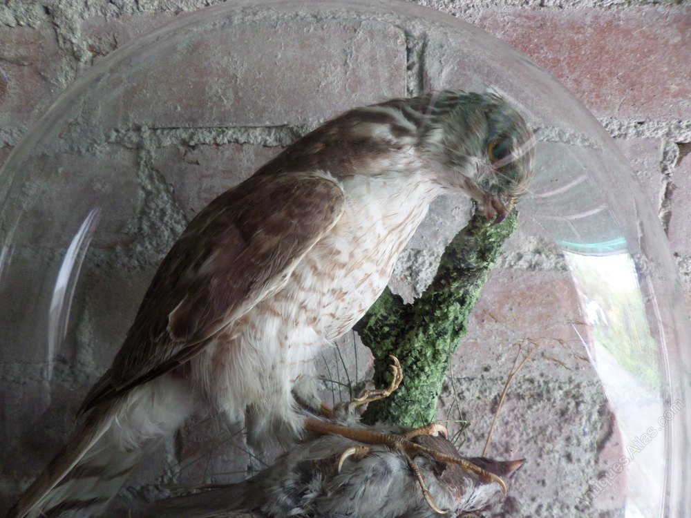 A very nice specimen of the Art of Taxidermy by a Victorian Taxidermist of a Sparrowhawk with their Prey at his feet. This has been set in a careful way amongst natural grasses in a Glass Dome.The Dome measures: 14.5 inches in height--13.00 inches in width and 6.5 inches in depth. MORE PHOTOGRAPHS will follow shortly but as this has just 'Flown in'--I mean it 'Has come my way' I wanted to give it a place on the site straightaway. PRICE REDUCTION to £300--WAS £350!