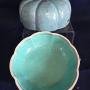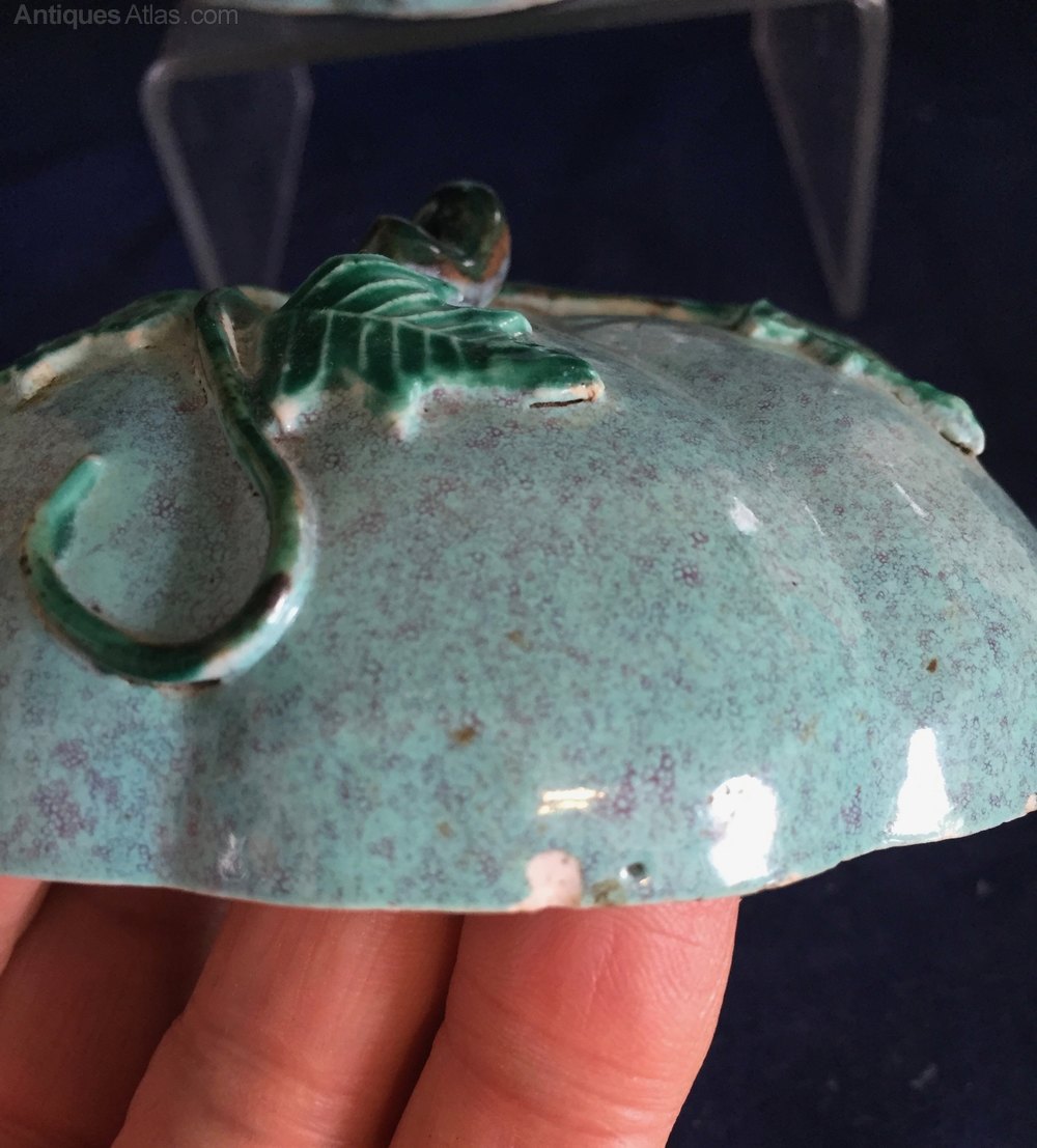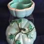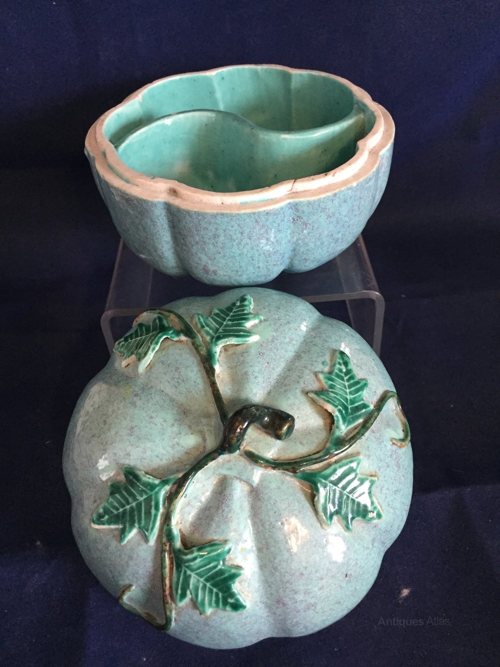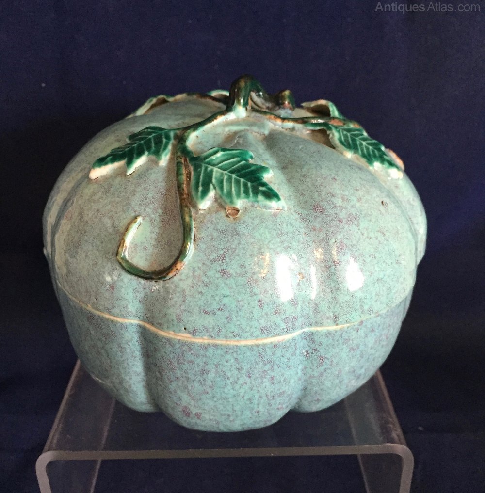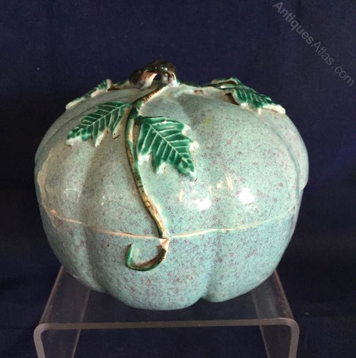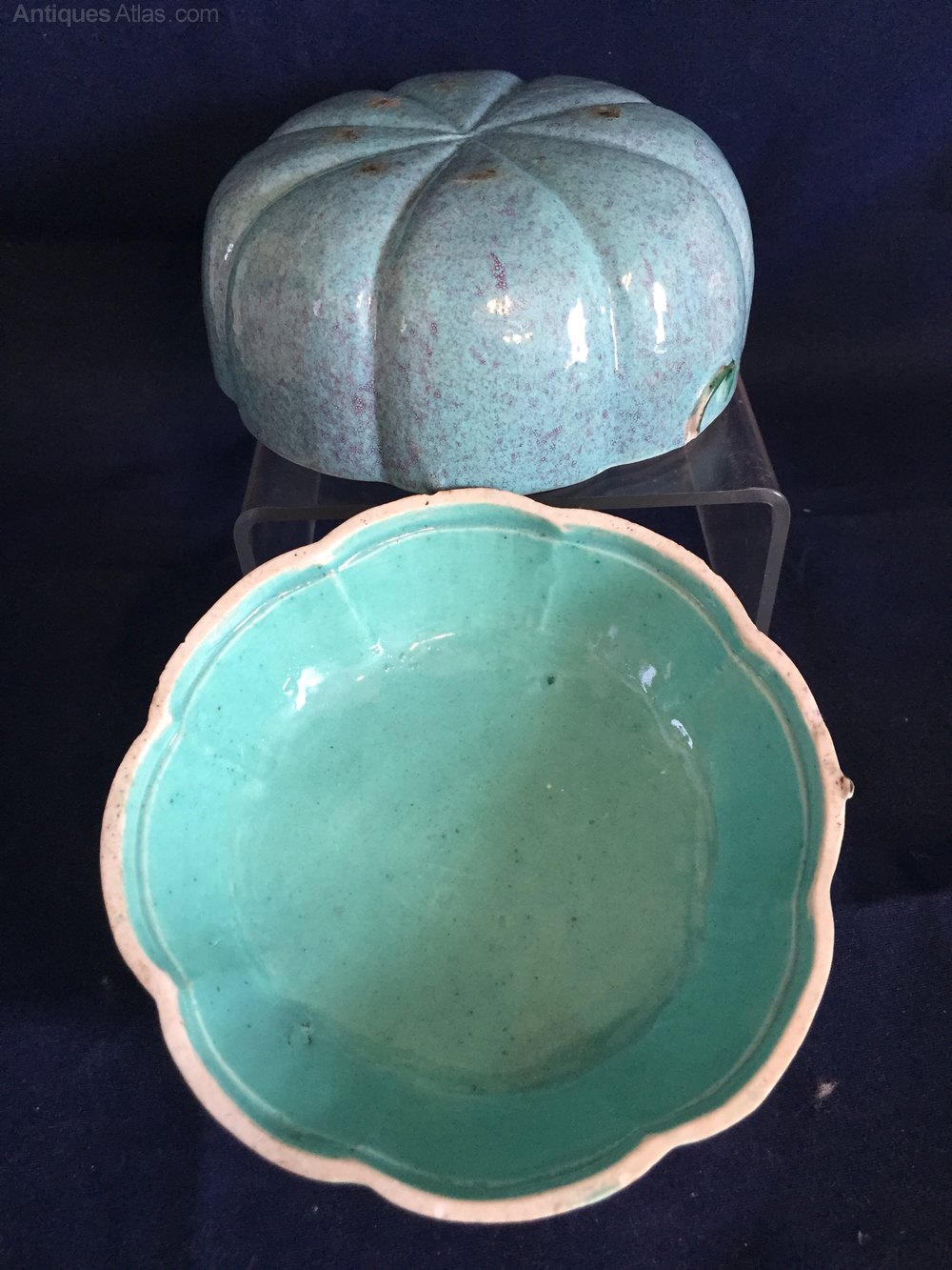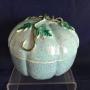 A chinese porcelain box in the form of a melon. It is covered in a robins egg glaze and the interior is divided in two in a yin/yang style.Dating from the C19th., it measures 11.4cm across and weighs 573gm.