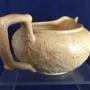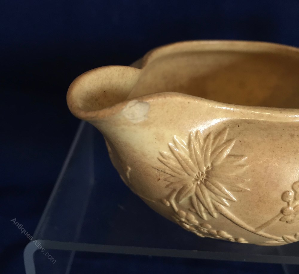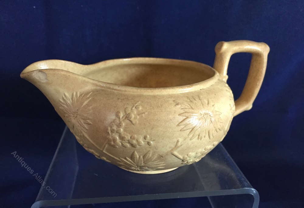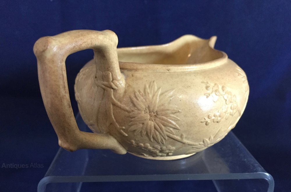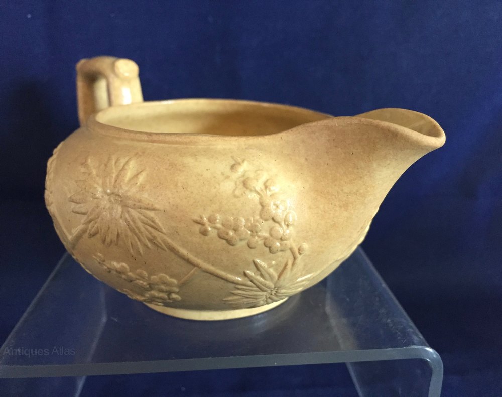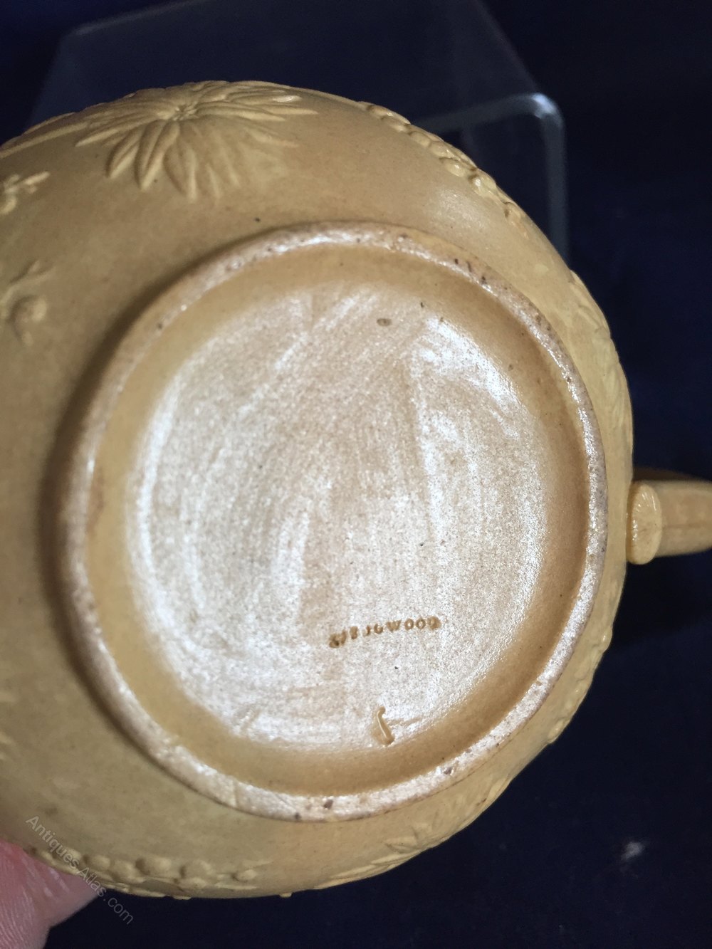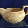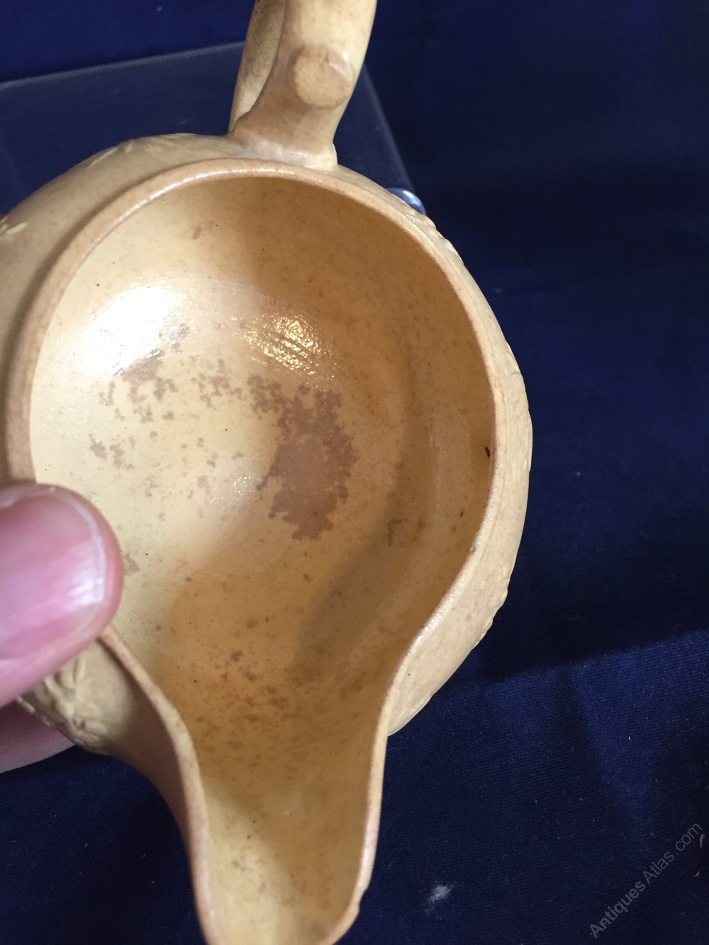 A Wedgwood caneware cream jug thinly potted and finely moulded.Dating from the early C19th., it measures 13cm from the tips of handle and spout and weighs 100gm