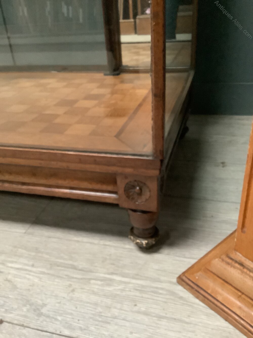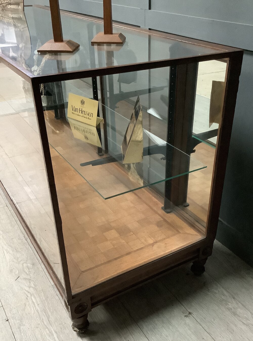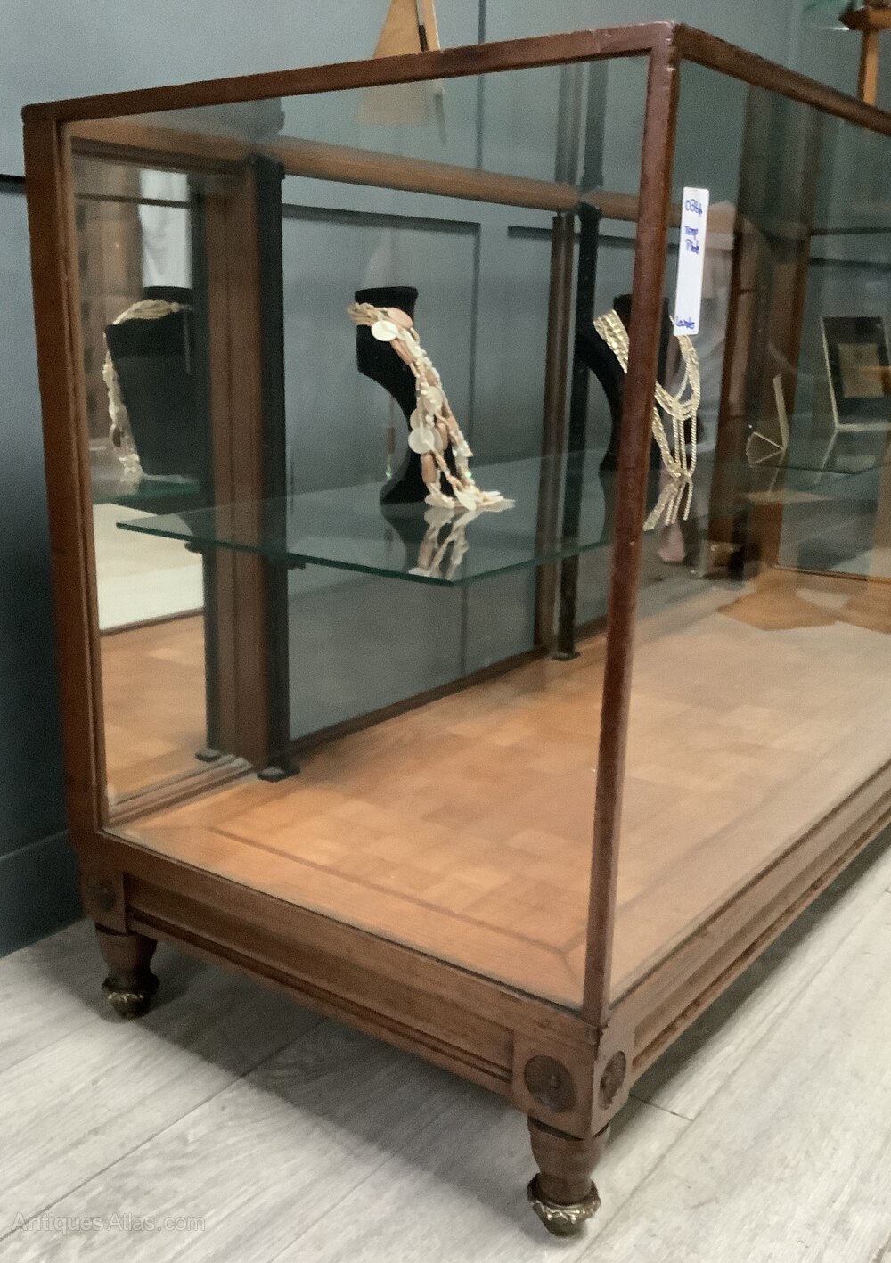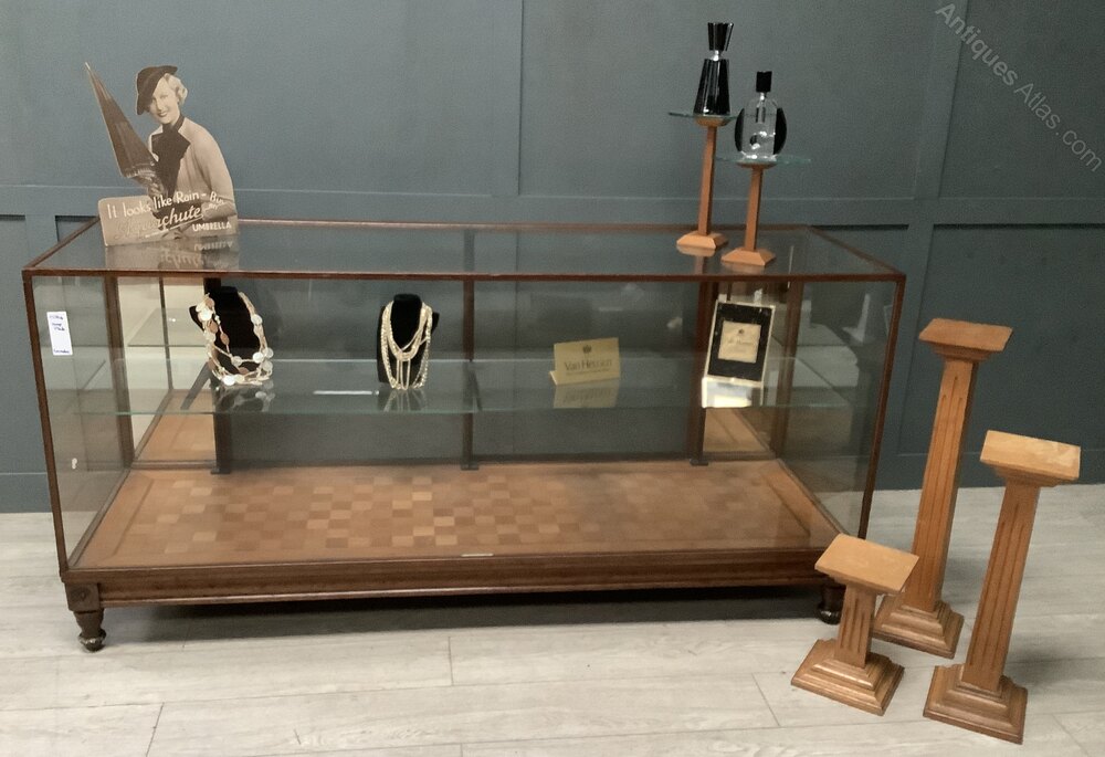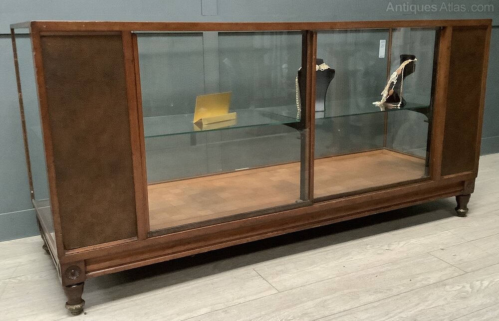 This is a super F. Sage & Co Ltd of London mahogany shop display counter cabinet dating from c1910. This cabinet is in superb condition throughout offering 2 adjustable glass shelves sat on adjustable cast brackets that come in 2 halves for ease of removal. The inner base is parquet in a square design. It is access via two glass sliding doors with mahogany trim just emphasising the quality of the cabinet. To the right and left of the inner back either side of the doors is two mirrored panels and these on the outside are covered with a leatherette material again showing to quality and time put into a F.Sage counter. The counter has tapered legs and these each have brass caps.